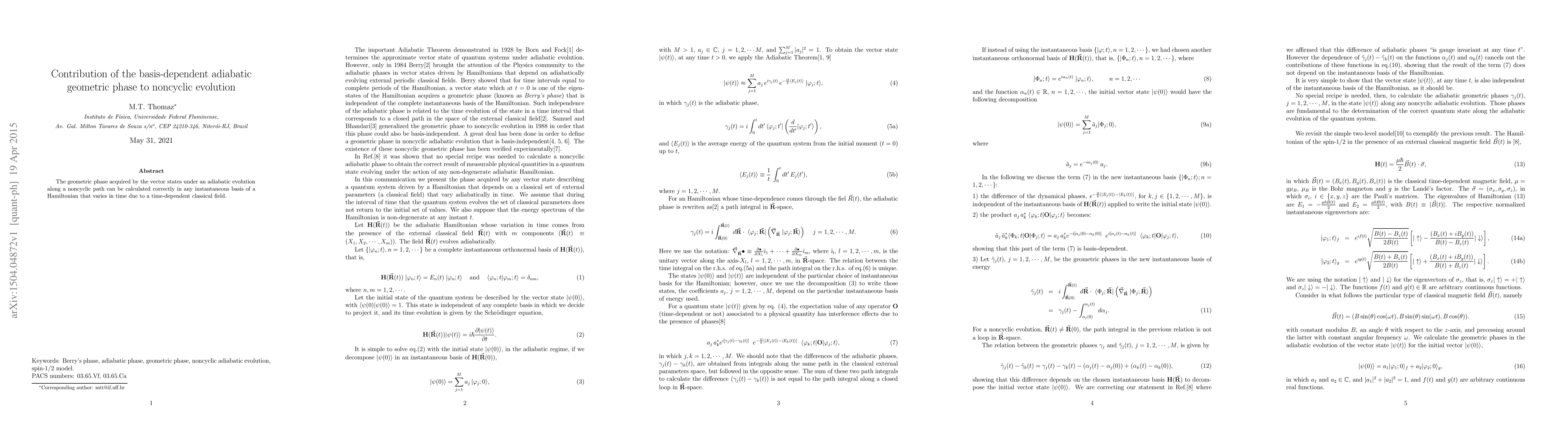 Summary: This paper demonstrates that the adiabatic geometric phase for vector states under noncyclic evolution can be accurately computed in any instantaneous basis, highlighting the basis-dependent nature of this geometric phase in time-dependent Hamiltonians.