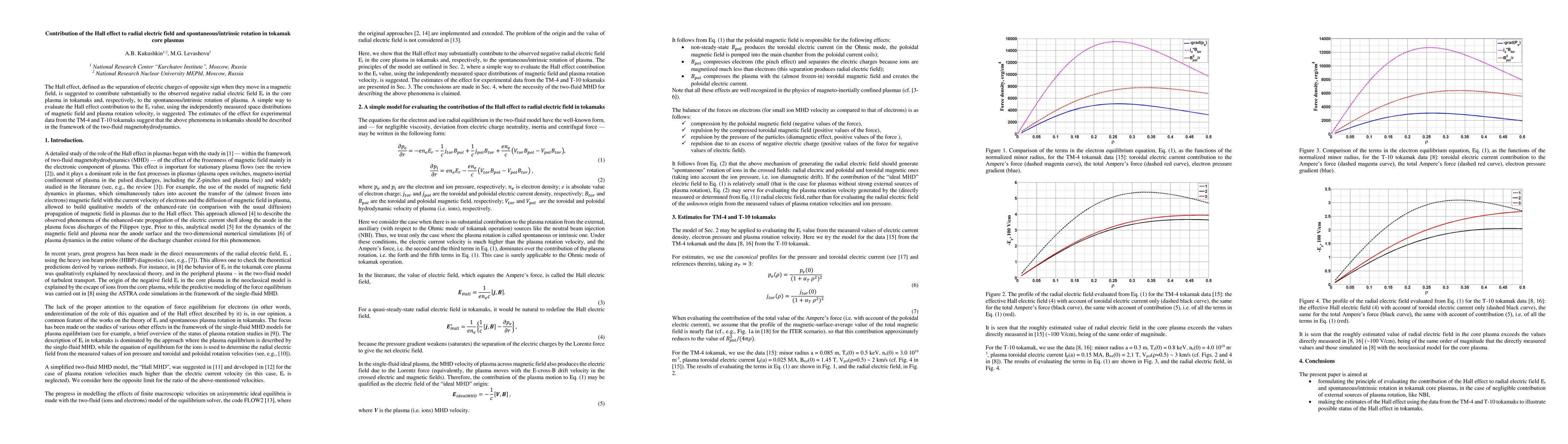 The Hall effect, defined as the separation of electric charges of opposite sign when they move in a magnetic field, is suggested to contribute substantially to the observed negative radial electric field Er in the core plasma in tokamaks and, respectively, to the spontaneous/intrinsic rotation of plasma. A simple way to evaluate the Hall effect contribution to the Er value, using the independently measured space distributions of magnetic field and plasma rotation velocity, is suggested. The estimates of the effect for experimental data from the TM-4 and T-10 tokamaks suggest that the above phenomena in tokamaks should be described in the framework of the two-fluid magnetohydrodynamics.