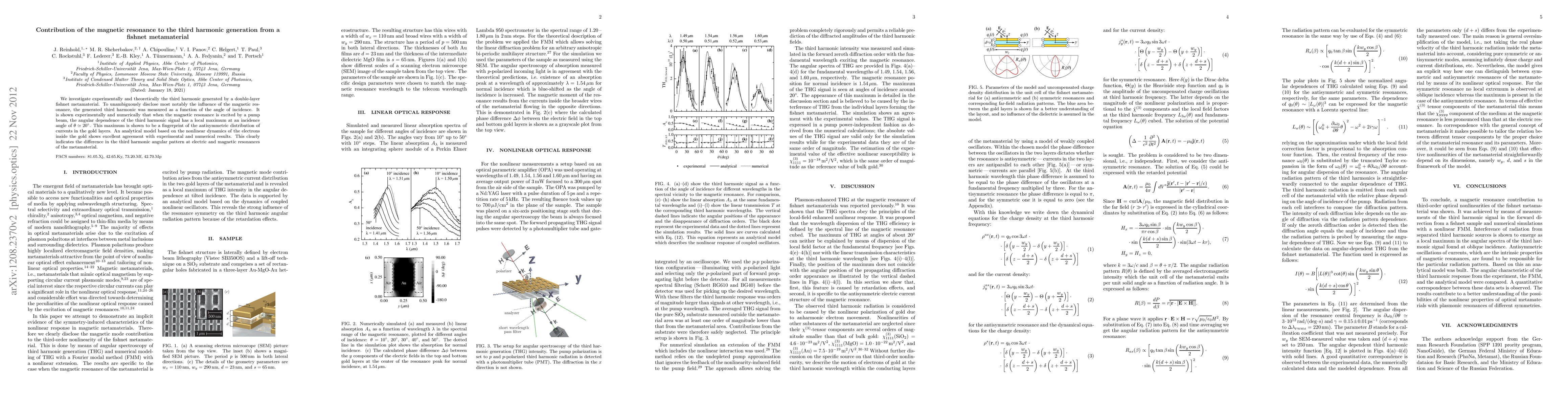This paper investigates the third harmonic generation in a double-layer fishnet metamaterial, demonstrating that magnetic resonance significantly influences the angular dependence of the generated harmonic. The study reveals a local maximum at an incidence angle of approximately 20°, indicating the antisymmetric current distribution in the gold layers.