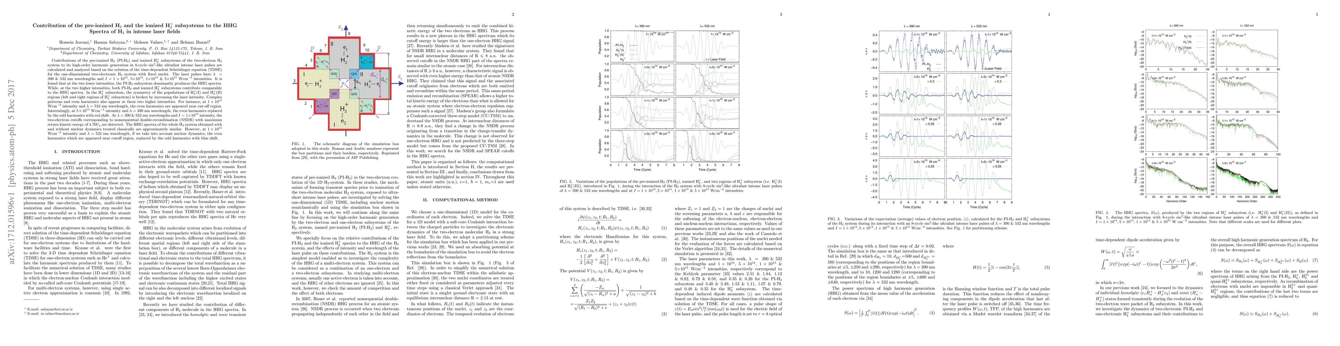 Contributions of the pre-ionized H$_2$ (PI-H$_2$) and ionized H$_2^+$ subsystems of the two-electron H$_2$ system to its high-order harmonic generation in 8-cycle $\sin^{2}$-like ultrafast intense laser pulses are calculated and analyzed based on the solution of the time-dependent Schr\"{o}dinger equation (TDSE) for the one-dimensional two-electronic H$_2$ system with fixed nuclei. The laser pulses have $\lambda\ =\ 390\ \&\ 532$ nm wavelengths and $I=1\times 10^{14}$, 5$\times 10^{14}$, 1$\times 10^{15}$ \&\ 5$\times 10^{15}$ Wcm$^{-2}$ intensities. It is found that at the two lower intensities, the PI-H$_2$ subsystem dominantly produces the HHG spectra. While, at the two higher intensities, both PI-H$_2$ and ionized H$_2^+$ subsystems contribute comparably to the HHG spectra. In the H$_2^+$ subsystem, the symmetry of the populations of H$_2^+$(I) and H$_2^+$(II) regions (left and right regions of H$_2^+$ subsystem) is broken by increasing the laser intensity. Complex patterns and even harmonics also appear at these two higher intensities. For instance, at $1\times 10^{15}$ Wcm$^{-2}$ intensity and $\lambda$ = 532 nm, the even harmonics are appeared near cut-off region. Interestingly, at $5\times 10^{15}$ Wcm$^{-2}$ intensity and $\lambda$ = 390 nm, the even harmonics replaced by the odd harmonics with red shift. At $\lambda$ = 390 \&\ 532 nm and $I=1\times 10^{15}$ intensity, the two-electron cutoffs corresponding to nonsequential double-recombination (NSDR) with maximum return kinetic energy of 4.70$U_p$ are detected. The HHG spectra of the whole H$_2$ system obtained with and without nuclear dynamics treated classically are approximately similar. However, at $1\times 10^{15}$ Wcm$^{-2}$ intensity and $\lambda$ = 532 nm, if we take into account nuclear dynamics, the even harmonics which are appeared near cutoff region, replaced by the odd harmonics with blue shift.