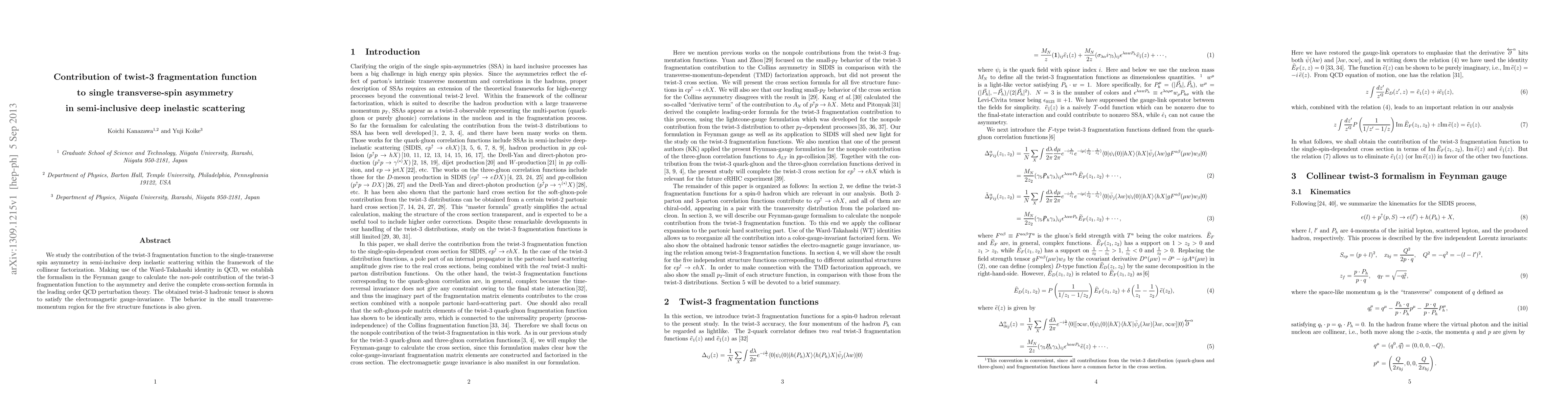 This paper investigates the twist-3 fragmentation function's role in the single-transverse spin asymmetry in semi-inclusive deep inelastic scattering. It derives a complete cross-section formula using the collinear factorization and QCD's Ward-Takahashi identity, ensuring electromagnetic gauge-invariance and analyzing the behavior of five structure functions in the small transverse-momentum region.