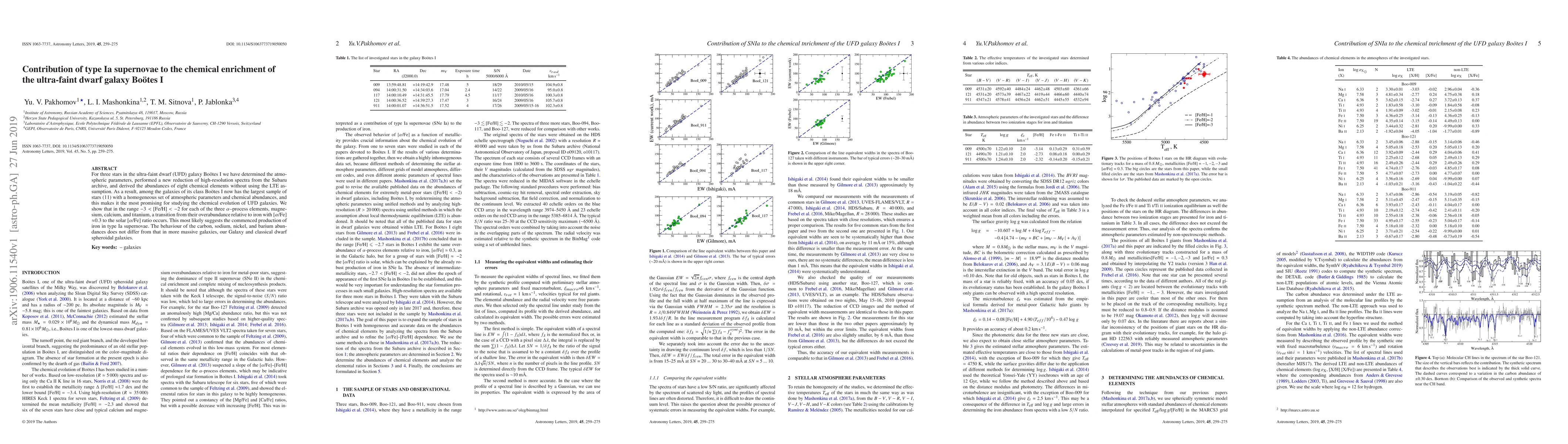 For three stars in the ultra-faint dwarf (UFD) galaxy Bootes I we have determined the atmospheric parameters, performed a new reduction of high-resolution spectra from the Subaru archive, and derived the abundances of eight chemical elements without using the LTE assumption. As a result, among the galaxies of its class Bootes I now has the largest sample of stars (11) with a homogeneous set of atmospheric parameters and chemical abundances, and this makes it the most promising for studying the chemical evolution of UFD galaxies. We show that in the range -3<[Fe/H]<-2 for each of the three $\alpha$--process elements, magnesium, calcium, and titanium, a transition from their overabundance relative to iron with [$\alpha$/Fe]$\approx$0.3 to the solar [$\alpha$/Fe] ratio occurs. This most likely suggests the commenced production of iron in type Ia supernovae. The behaviour of the carbon, sodium, nickel, and barium abundances does not differ from that in more massive galaxies, our Galaxy and classical dwarf spheroidal galaxies.