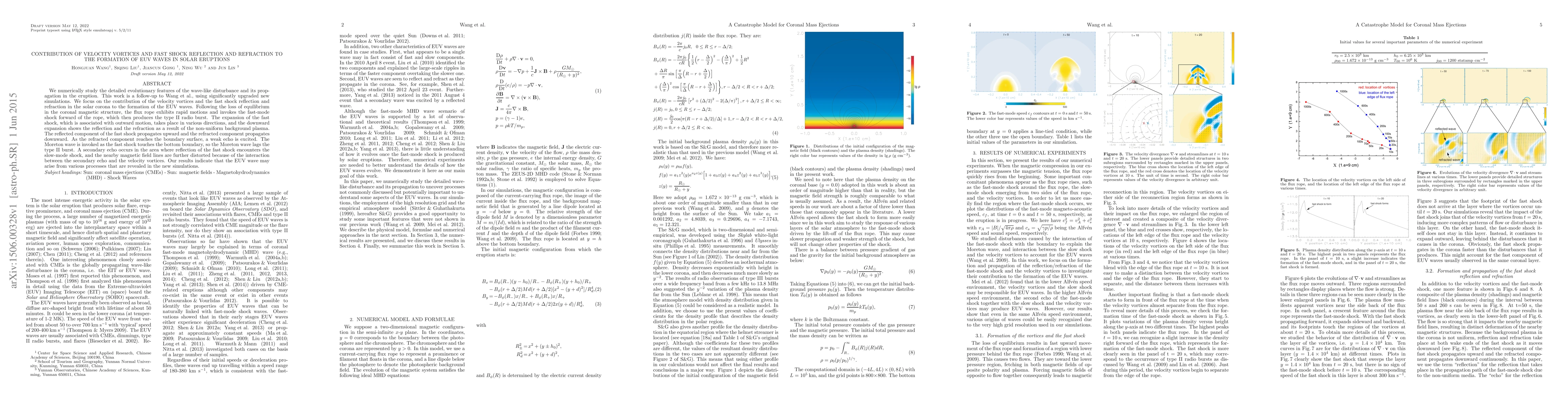 This paper uses advanced simulations to explore how velocity vortices and fast shock reflection and refraction in the solar corona contribute to the formation of EUV waves during solar eruptions. The study reveals that the interaction of these processes leads to the generation of various wave phenomena, including the Moreton wave and secondary echoes.