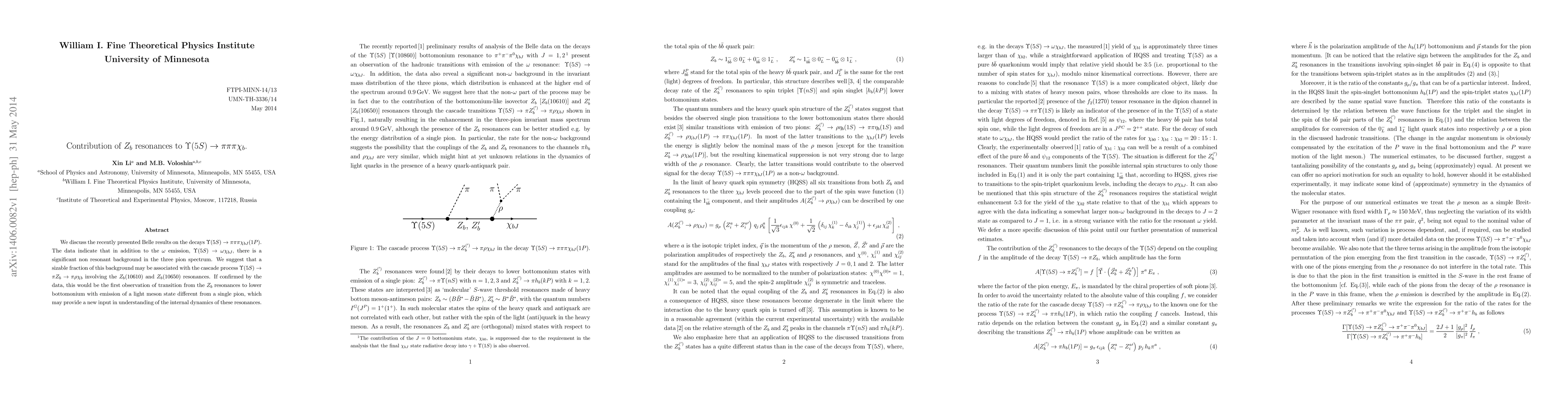 We discuss the recently presented Belle results on the decays $\Upsilon(5S) \to \pi \pi \pi \chi_{bJ}(1P)$. The data indicate that in addition to the $\omega$ emission, $\Upsilon(5S) \to \omega \chi_{bJ}$, there is a significant non resonant background in the three pion spectrum. We suggest that a sizable fraction of this background may be associated with the cascade process $\Upsilon(5S) \to \pi Z_b \to \pi \rho \chi_b$ involving the $Z_b(10610)$ and $Z_b(10650)$ resonances. If confirmed by the data, this would be the first observation of transition from the $Z_b$ resonances to lower bottomonium with emission of a light meson state different from a single pion, which may provide a new input in understanding of the internal dynamics of these resonances.