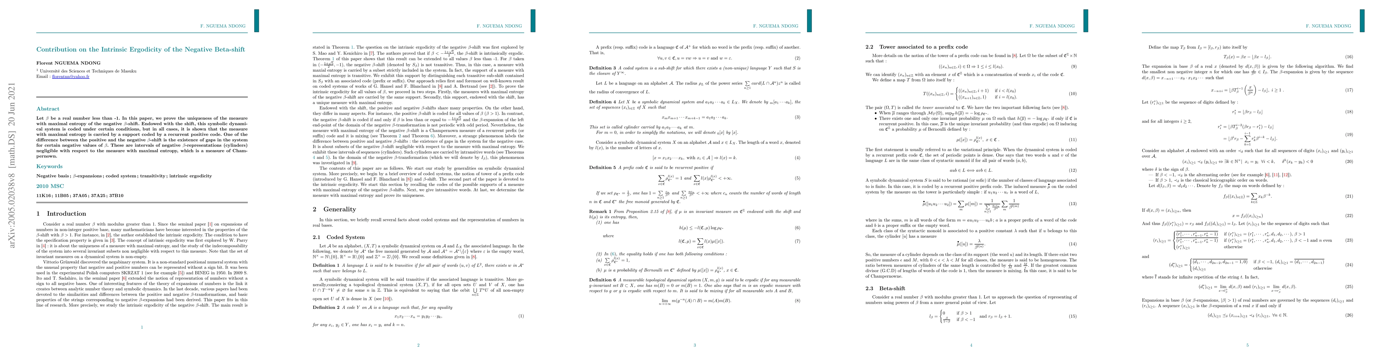 Let $ \beta $ be a real number less than -1. In this paper, we prove the uniqueness of the measure with maximal entropy of the negative $\beta$-shift. Endowed with the shift, this symbolic dynamical system is coded under certain conditions, but in all cases, it is shown that the measure with maximal entropy is carried by a support coded by a recurrent positive code. One of the difference between the positive and the negative $\beta$-shift is the existence of gaps in the system for certain negative values of $ \beta $ . These are intervals of negative $\beta$-representations (cylinders) negligible with respect to the measure with maximal entropy, which is a measure of Champernown.
