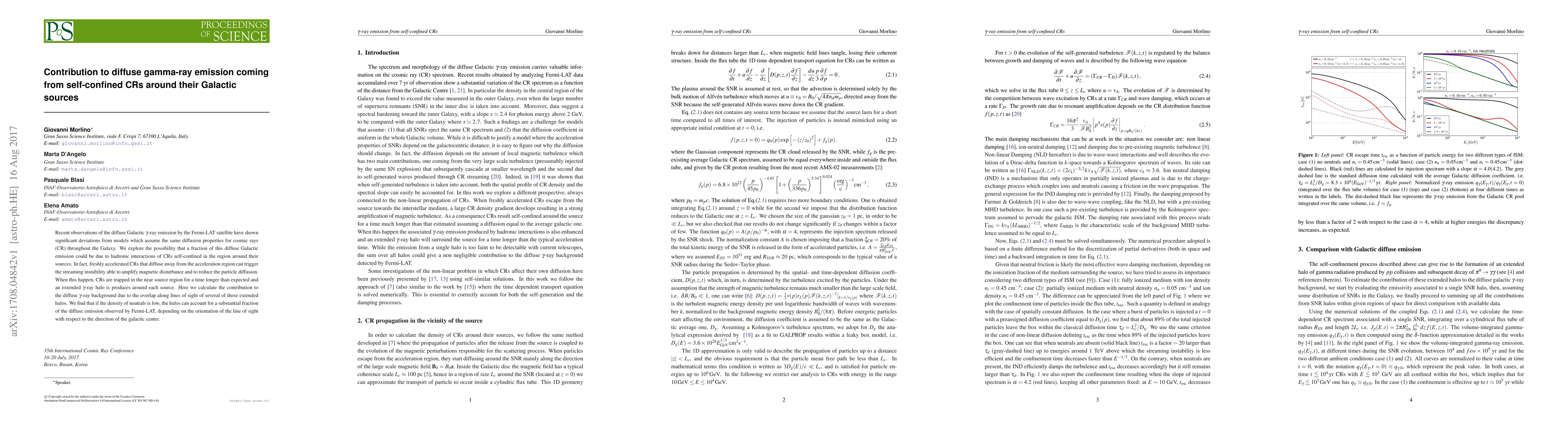 This paper investigates the contribution of gamma-ray emission from cosmic rays self-confined near their sources to the diffuse Galactic gamma-ray background, suggesting that these trapped CRs can produce extended gamma-ray halos, potentially explaining deviations in Fermi-LAT observations. The study finds that low neutral densities allow these halos to account for a significant portion of the observed diffuse emission.