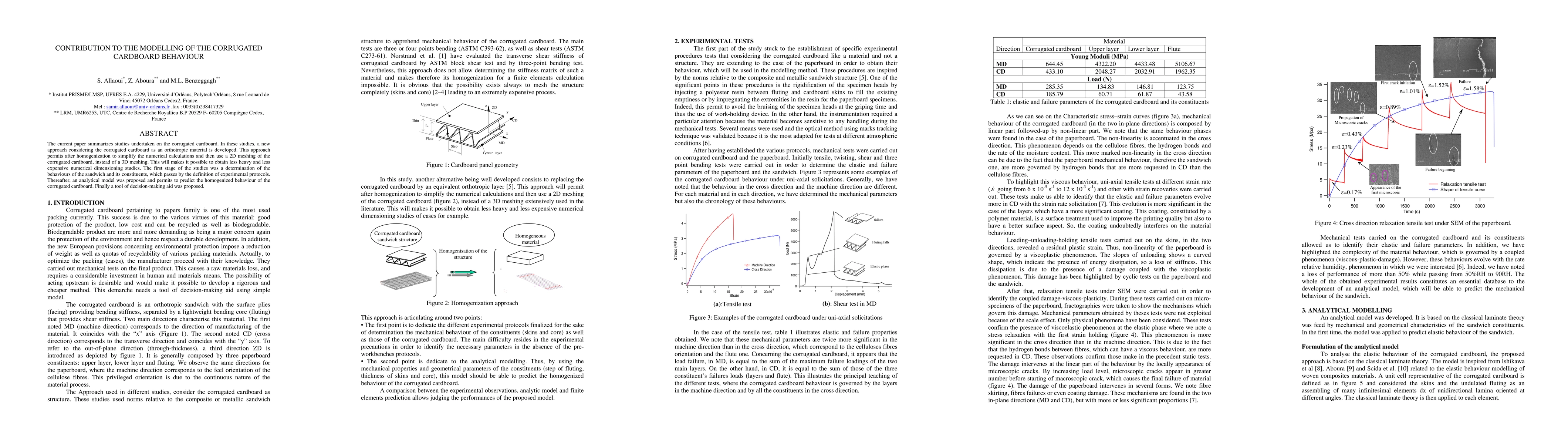 The current paper summarizes studies undertaken on the corrugated cardboard. In these studies, a new approach considering the corrugated cardboard as an orthotropic material is developed. This approach permits after homogenization to simplify the numerical calculations and then use a 2D meshing of the corrugated cardboard, instead of a 3D meshing. This will makes it possible to obtain less heavy and less expensive numerical dimensioning studies. The first stage of the studies was a determination of the behaviours of the sandwich and its constituents, which passes by the definition of experimental protocols. Thereafter, an analytical model was proposed and permits to predict the homogenized behaviour of the corrugated cardboard. Finally a tool of decision-making aid was proposed.