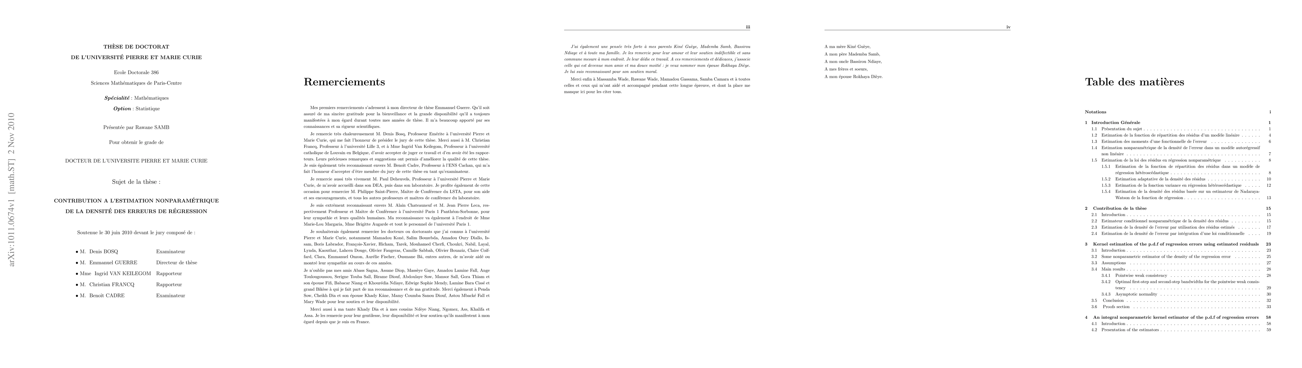 This thesis deals with the nonparametric estimation of density f of the regression error term E of the model Y=m(X)+E, assuming its independence with the covariate X. The difficulty linked to this study is the fact that the regression error E is not observed. In a such setup, it would be unwise, for estimating f, to use a conditional approach based upon the probability distribution function of Y given X. Indeed, this approach is affected by the curse of dimensionality, so that the resulting estimator of the residual term E would have considerably a slow rate of convergence if the dimension of X is very high. Two approaches are proposed in this thesis to avoid the curse of dimensionality. The first approach uses the estimated residuals, while the second integrates a nonparametric conditional density estimator of Y given X. If proceeding so can circumvent the curse of dimensionality, a challenging issue is to evaluate the impact of the estimated residuals on the final estimator of the density f. We will also attempt to determine the pointwise rate of convergence of our proposed estimators. One our main aims is to characterize the optimal choices of the first and second step bandwidths used for estimating m and f respectively.