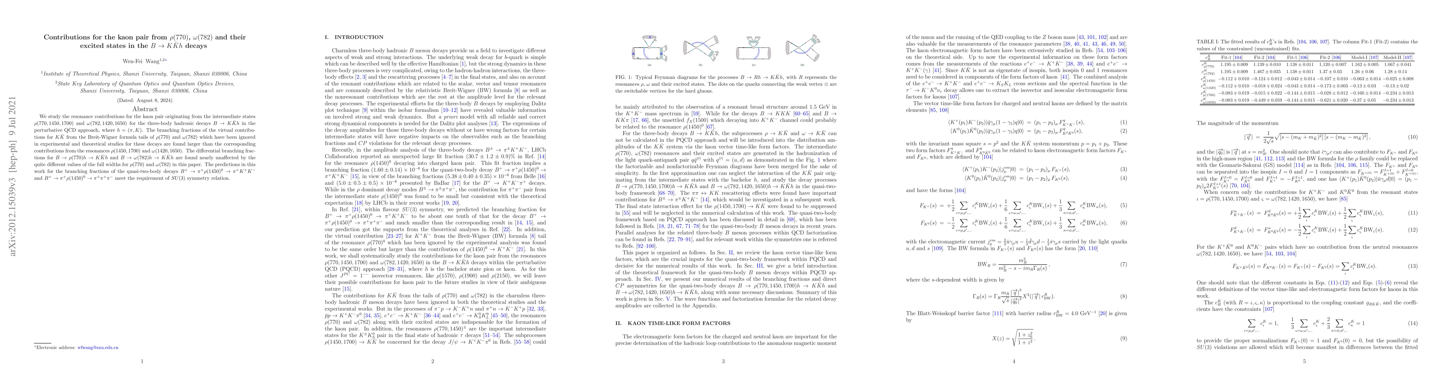 This paper investigates kaon pair contributions from $\rho$ and $\omega$ resonances in $B\to K\bar K h$ decays using perturbative QCD, finding larger branching fractions from $\rho(770)$ and $\omega(782)$ than from their excited states, and meets $SU(3)$ symmetry for specific quasi-two-body decays.