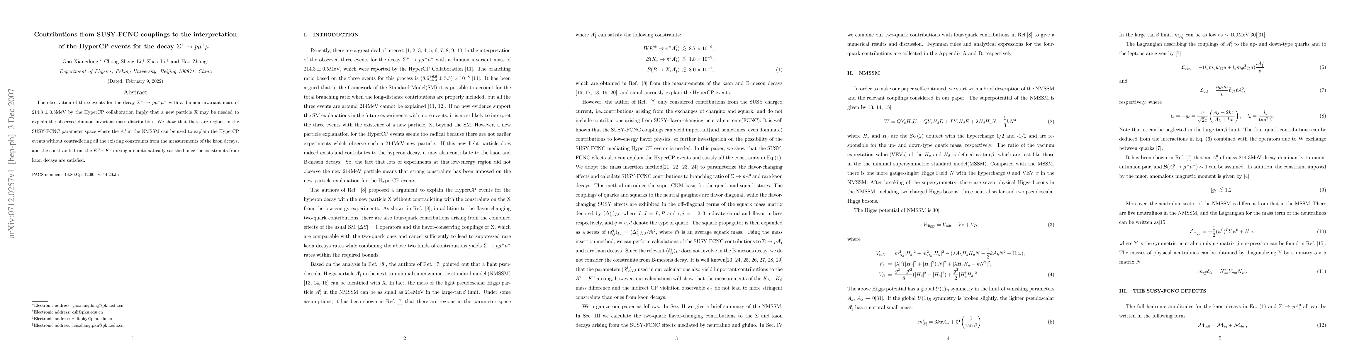 The HyperCP collaboration observed three events for the decay $\Sigma^+ \to p \mu^+ \mu^-$, suggesting a potential new particle X. The paper demonstrates that SUSY-FCNC couplings in the NMSSM can explain these events via the $A^0_1$ particle without violating existing constraints from kaon decay measurements.