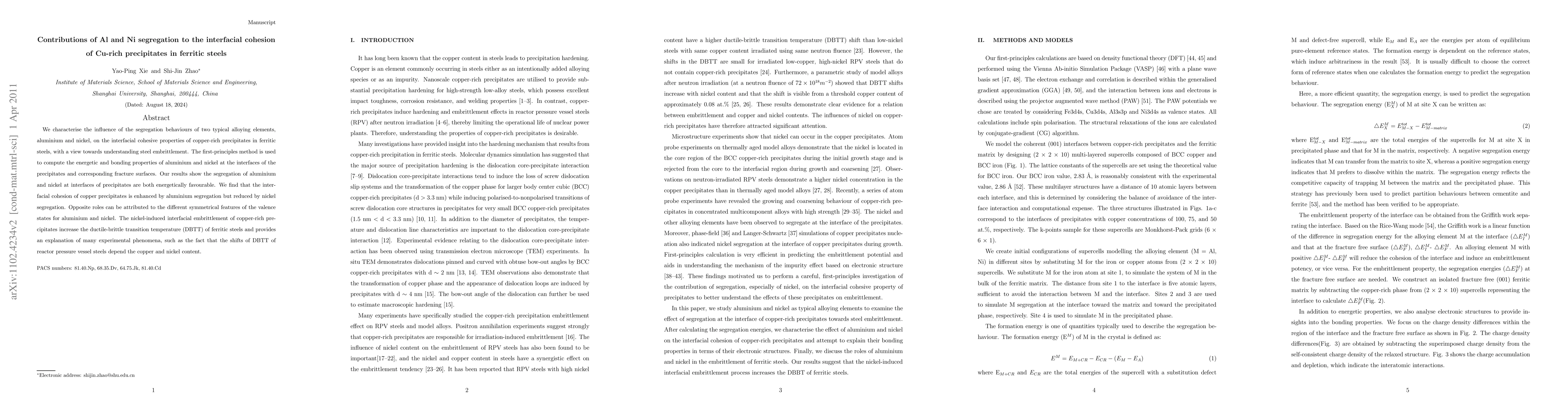 This paper investigates the segregation of aluminium and nickel at interfaces of copper-rich precipitates in ferritic steels to understand their impact on steel embrittlement. Aluminium enhances interfacial cohesion, while nickel reduces it, leading to increased ductile-brittle transition temperature (DBTT) due to nickel-induced embrittlement.