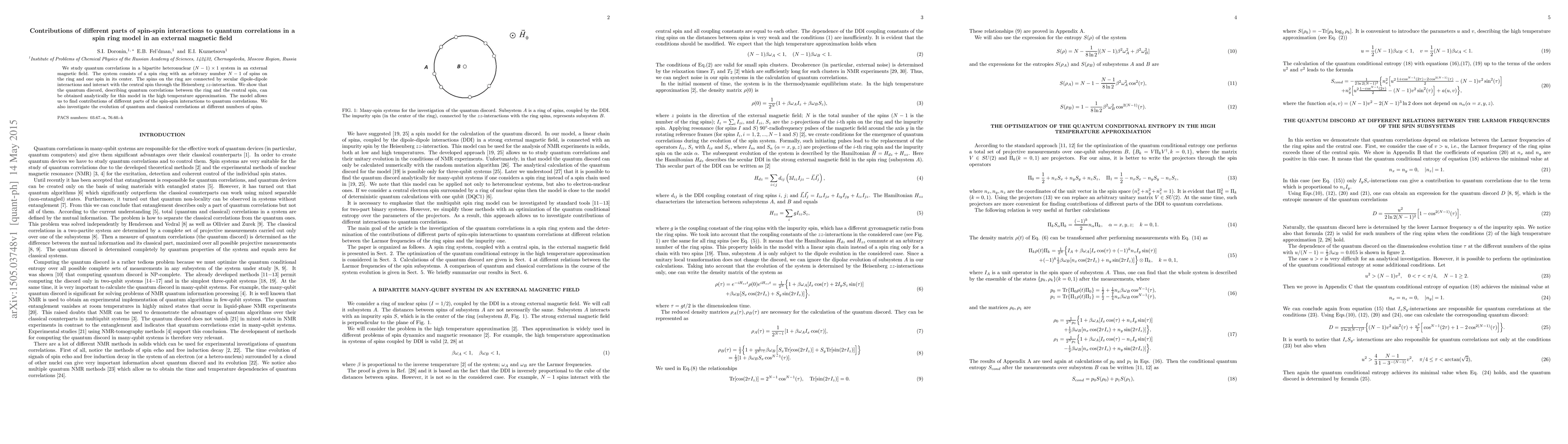 Researchers studied quantum correlations in a spin ring model with varying numbers of spins, finding that different parts of spin-spin interactions contribute to quantum discord, which can be analytically calculated at high temperatures.