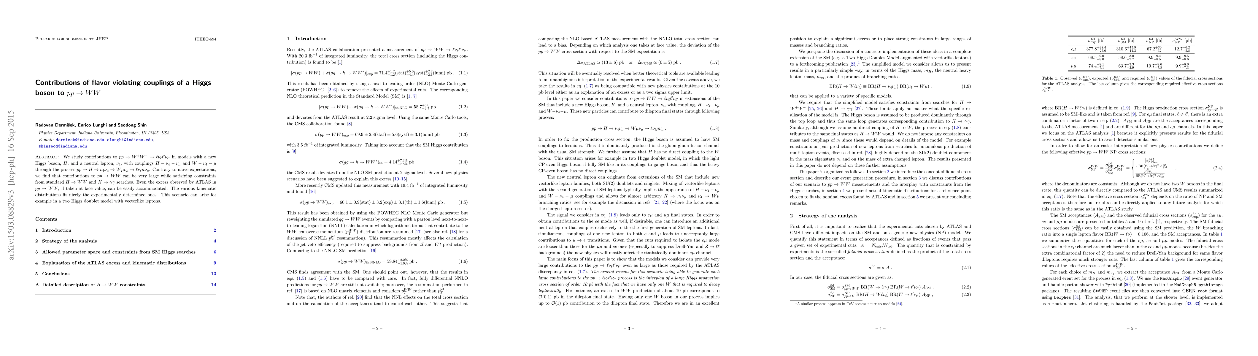 This paper investigates the significant contributions of flavor-violating Higgs couplings to the production of $W$ bosons in proton-proton collisions, finding that these contributions can be substantial even when adhering to standard model constraints. The study suggests that this phenomenon can be explained by a new Higgs boson and a neutral lepton, fitting well with experimental data and potentially explaining observed excesses.
