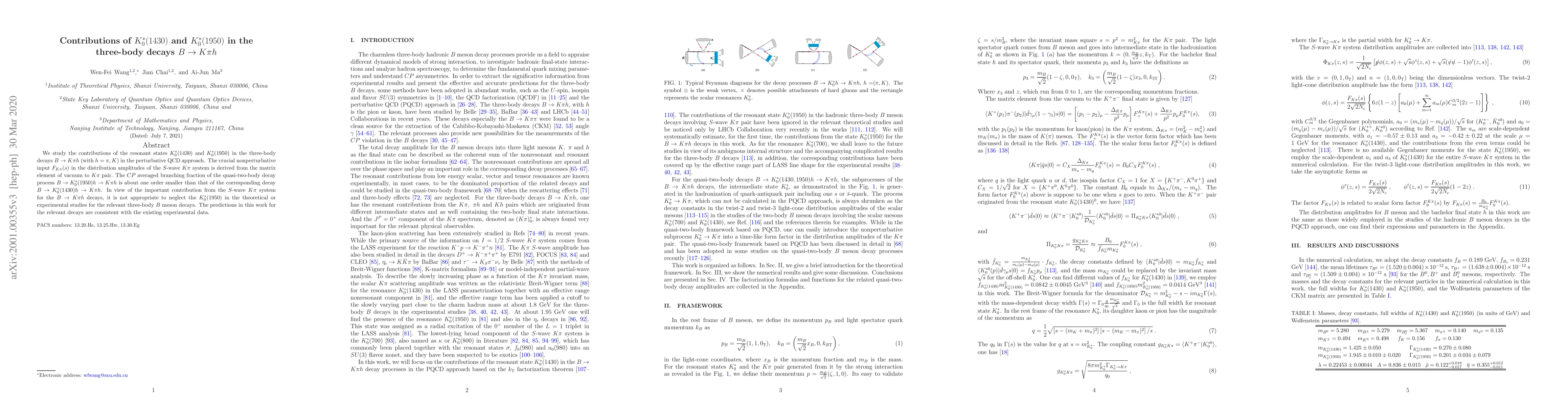 This paper investigates the contributions of $K_0^*(1430)$ and $K_0^*(1950)$ resonances in three-body decays $B\to K\pi h$ using the perturbative QCD approach. It highlights the importance of $K_0^*(1950)$ in these decays, despite its smaller $CP$ averaged branching fraction compared to $K_0^*(1430)$.
