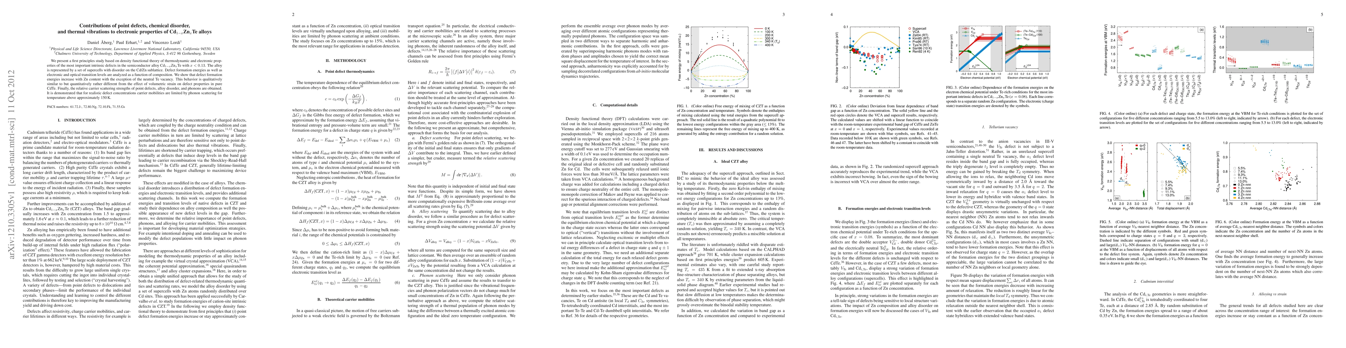 The study investigates electronic properties of Cd(1-x)Zn(x)Te alloys, revealing that defect formation energies increase with Zn content, except for the neutral Te vacancy, and carrier mobility is limited by phonon scattering at temperatures above 150K.