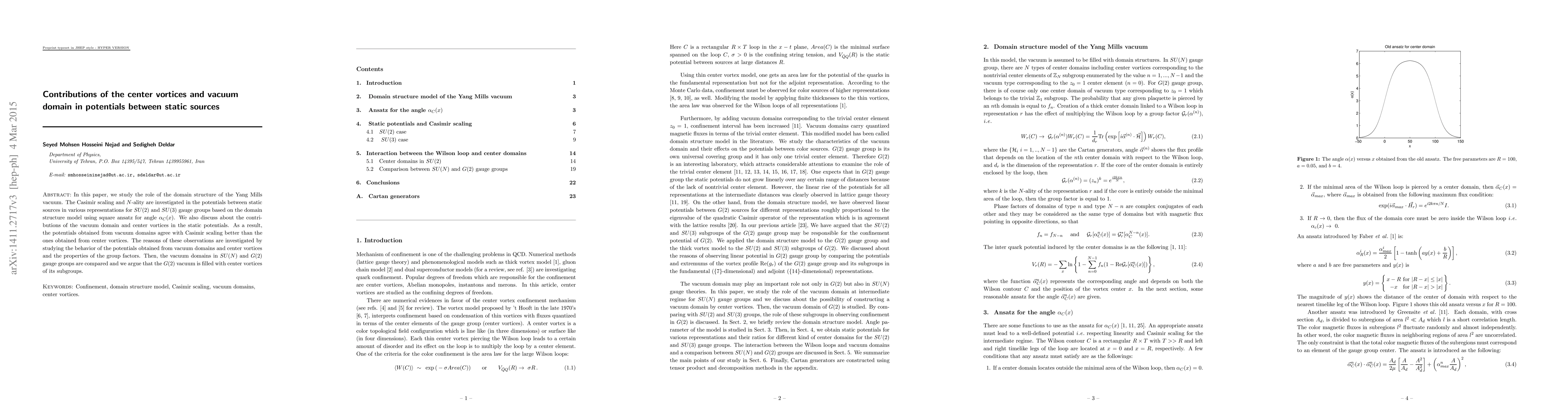 Researchers studied the role of center vortices and vacuum domains in potential functions between static sources in various gauge groups, finding that vacuum domain potentials agree with Casimir scaling better than center vortex potentials.