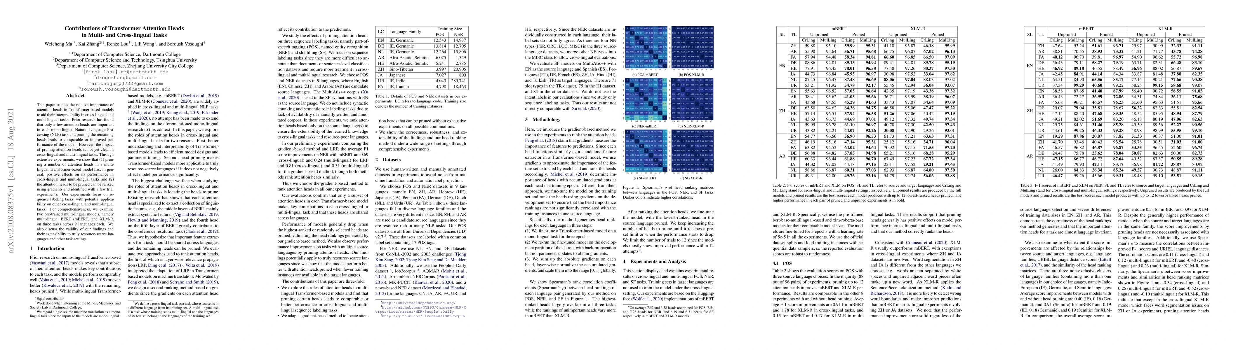This paper investigates the impact of pruning attention heads in Transformer-based models for cross-lingual and multi-lingual tasks, demonstrating that pruning generally enhances performance and identifying optimal heads to prune through gradient-based ranking. Experiments on sequence labeling tasks using mBERT and XLM-R across 9 languages show promising results and potential for broader applicability.