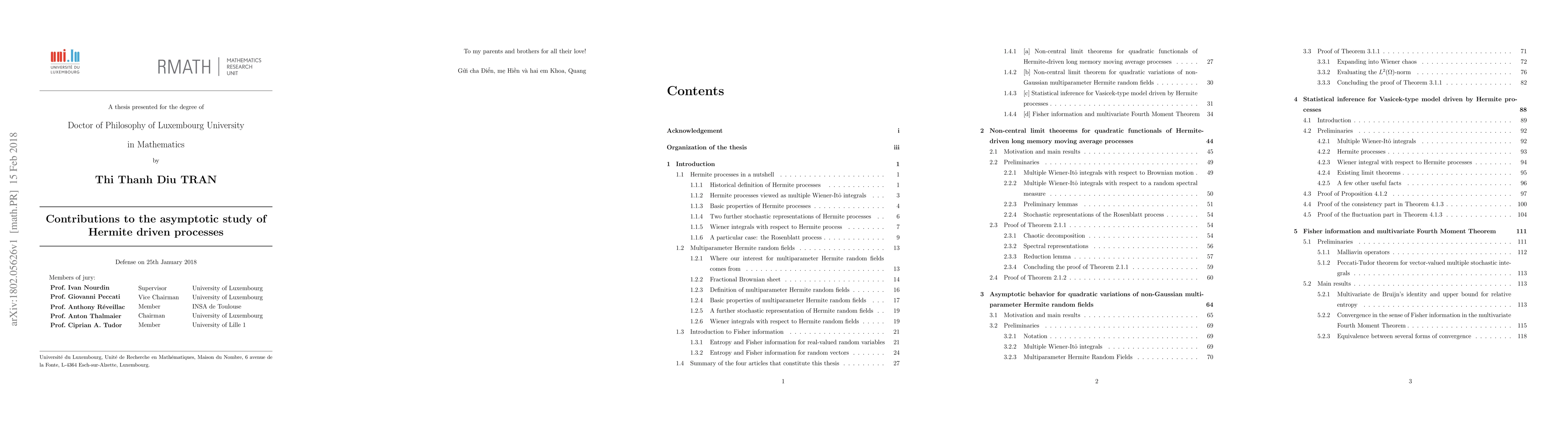 This thesis consists of two parts. Part I is an introduction to Hermite processes, Hermite random fields, Fisher information and to the papers constituting the thesis. More precisely, in Section 1 we introduce Hermite processes in a nutshell, as well as some of its basic properties. It is the necessary background for the articles [a] and [c]. In Section 2 we consider briefly the multiparameter Hermite random fields and we study some less elementary facts which are used in the article [b]. In section 3, we recall some terminology about Fisher information related to the article [d]. Finally, our articles [a] to [d] are summarised in Section 4. Part II consists of the articles themselves: [a] T.T. Diu Tran (2017): Non-central limit theorem for quadratic functionals of Hermite-driven long memory moving average processes. \textit{Stochastic and Dynamics}, \textbf{18}, no. 4. [b] T.T. Diu Tran (2016): Asymptotic behavior for quadratic variations of non-Gaussian multiparameter Hermite random fields. Under revision for \textit{Probability and Mathematical Statistics}. [c] I. Nourdin, T.T. Diu Tran (2017): Statistical inference for Vasicek-type model driven by Hermite processes. Submitted to \textit{Stochastic Process and their Applications}. [d] T.T. Diu Tran (2017+): Fisher information and multivariate Fouth Moment Theorem. Main results have already been obtained. It should be submitted soon.