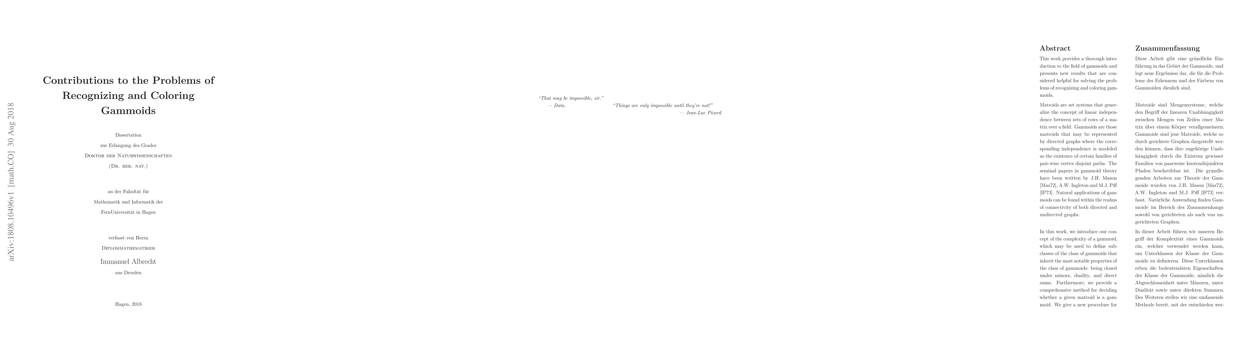 This work provides a thorough introduction to the field of gammoids and presents new results that are considered helpful for solving the problems of recognizing and coloring gammoids.