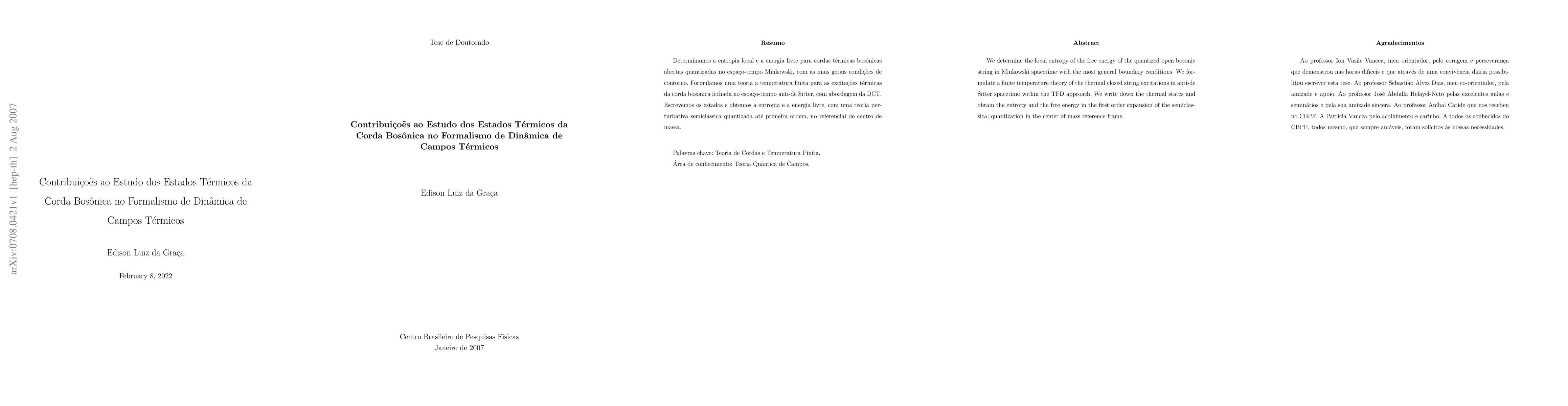 This paper determines the local entropy of the free energy for the quantized open bosonic string under general boundary conditions and formulates a finite temperature theory for thermal closed string excitations in anti-de Sitter spacetime using the TFD formalism, deriving entropy and free energy in the semiclassical approximation.