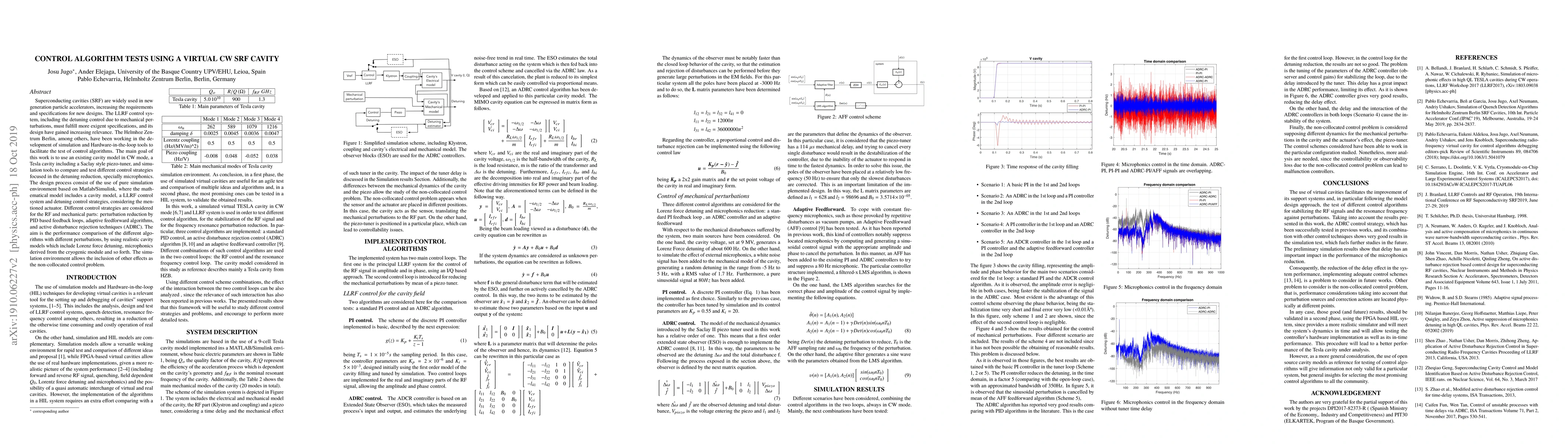 This paper tests various control algorithms for superconducting radiofrequency (SRF) cavities in continuous wave (CW) mode using a virtual model, focusing on reducing detuning due to microphonics and mechanical perturbations. The study compares PID feedback, adaptive feedforward, and active disturbance rejection techniques within a Matlab/Simulink simulation environment, aiming to optimize cavity performance under realistic conditions.
