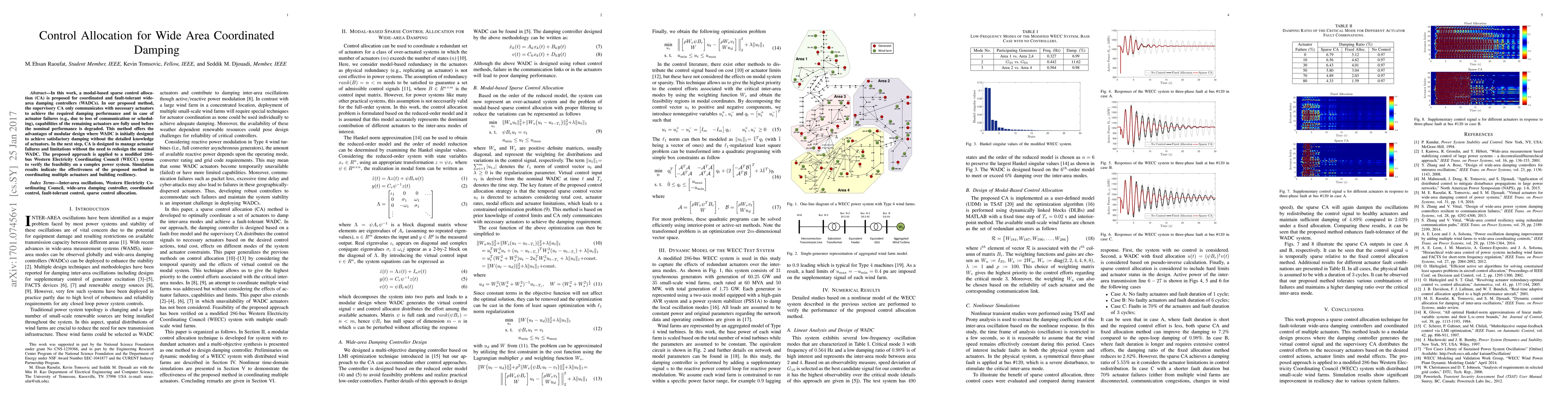 In this work, a modal-based sparse control allocation (CA) is proposed for coordinated and fault-tolerant wide-area damping controllers (WADCs). In our proposed method, the supervisory CA only communicates with necessary actuators to achieve the required damping performance and in case of actuator failures (e.g., due to loss of communication or scheduling), capabilities of the remaining actuators are fully used before the nominal performance is degraded. This method offers the advantages of modular design where WADC is initially designed to achieve satisfactory damping without the detailed knowledge of actuators. In the next step, CA is designed to manage actuator failures and limitations without the need to redesign the nominal WADC. The proposed approach is applied to a modified $286$-bus Western Electricity Coordinating Council (WECC) system to verify the feasibility on a complex power system. Simulation results indicate the effectiveness of the proposed method in coordinating multiple actuators and building resiliency.