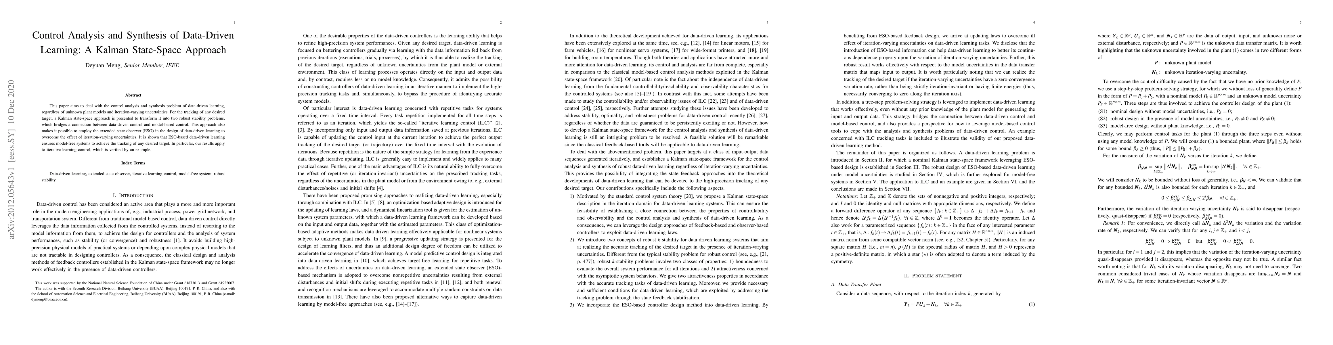 This paper proposes a Kalman state-space approach for data-driven learning control, transforming the problem into robust stability issues. It employs the extended state observer to handle iteration-varying uncertainties, enabling model-free systems to track desired targets, with applications to iterative learning control demonstrated through an example.