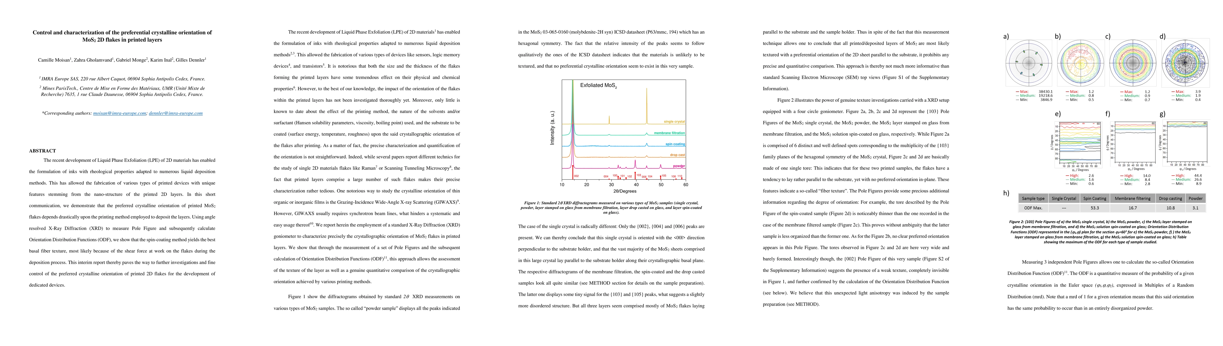 This research demonstrates that the preferred crystalline orientation of MoS2 flakes in printed layers significantly depends on the printing method used. Utilizing angle resolved XRD, the study finds that spin-coating produces the best basal fiber texture due to shear forces during deposition, suggesting potential for controlling crystal orientation in 2D material devices.