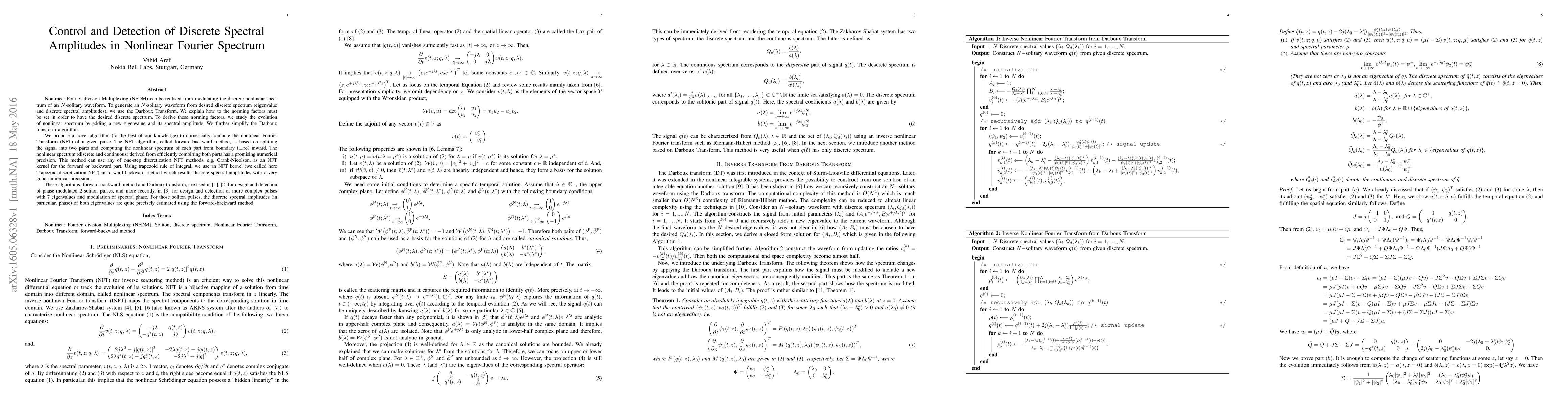 Nonlinear Fourier division Multiplexing (NFDM) can be realized from modulating the discrete nonlinear spectrum of an $N$-solitary waveform. To generate an $N$-solitary waveform from desired discrete spectrum (eigenvalue and discrete spectral amplitudes), we use the Darboux Transform. We explain how to the norming factors must be set in order to have the desired discrete spectrum. To derive these norming factors, we study the evolution of nonlinear spectrum by adding a new eigenvalue and its spectral amplitude. We further simplify the Darboux transform algorithm. We propose a novel algorithm (to the best of our knowledge) to numerically compute the nonlinear Fourier Transform (NFT) of a given pulse. The NFT algorithm, called forward-backward method, is based on splitting the signal into two parts and computing the nonlinear spectrum of each part from boundary ($\pm\infty$) inward. The nonlinear spectrum (discrete and continuous) derived from efficiently combining both parts has a promising numerical precision. This method can use any of one-step discretization NFT methods, e.g. Crank-Nicolson, as an NFT kernel for the forward or backward part. Using trapezoid rule of integral, we use an NFT kernel (we called here Trapezoid discretization NFT) in forward-backward method which results discrete spectral amplitudes with a very good numerical precision. These algorithms, forward-backward method and Darboux transform, are used in [1],[2] for design and detection of phase-modulated 2-soliton pulses, and more recently, in [3] for design and detection of more complex pulses with 7 eigenvalues and modulation of spectral phase. For those soliton pulses, the discrete spectral amplitudes (in particular, phase) of both eigenvalues are quite precisely estimated using the forward-backward method.