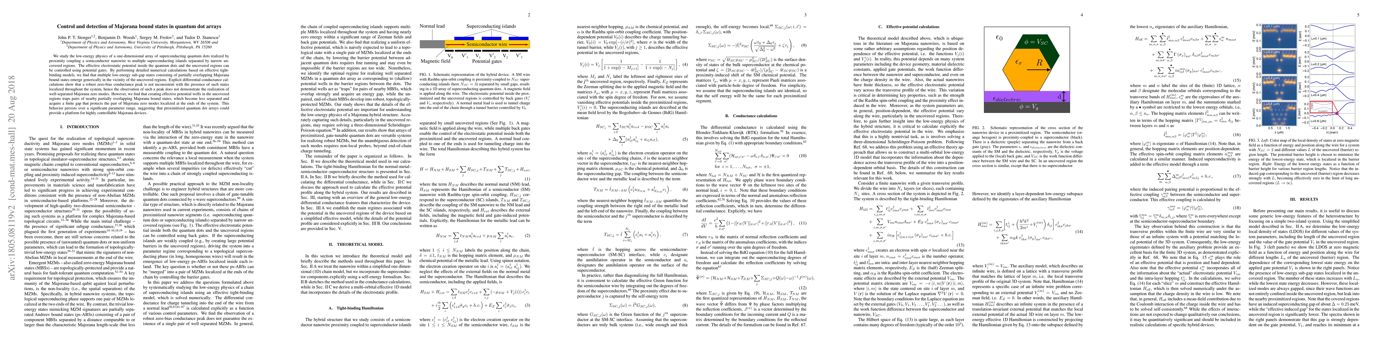 We study the low-energy physics of a one-dimensional array of superconducting quantum dots realized by proximity coupling a semiconductor nanowire to multiple superconducting islands separated by narrow uncovered regions. The effective electrostatic potential inside the quantum dots and the uncovered regions can be controlled using potential gates. By performing detailed numerical calculations based on effective tightbinding models, we find that multiple low-energy sub-gap states consisting of partially overlapping Majorana bound states emerge generically in the vicinity of the uncovered regions. Explicit differential conductance calculations show that a robust zero-bias conductance peak is not inconsistent with the presence of such states localized throughout the system, hence the observation of such a peak does not demonstrate the realization of well-separated Majorana zero modes. However, we find that creating effective potential wells in the uncovered regions traps pairs of nearby partially overlapping Majorana bound states, which become less separated and acquire a finite gap that protects the pair of Majorana zero modes localized at the ends of the system. This behavior persists over a significant parameter range, suggesting that proximitized quantum dot arrays could provide a platform for highly controllable Majorana devices.