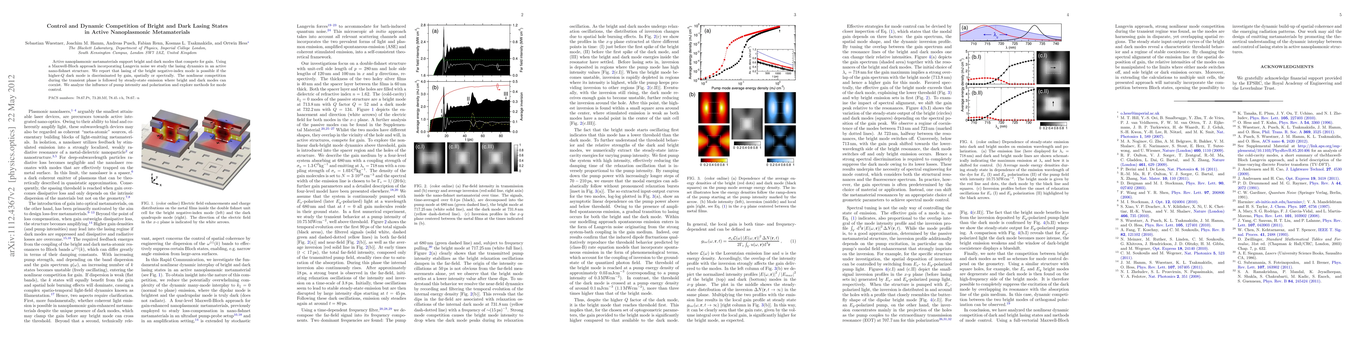 This paper investigates the dynamic competition between bright and dark lasing modes in active nanoplasmonic metamaterials using a Maxwell-Bloch approach. It demonstrates that bright negative-index mode lasing can occur if the higher-Q dark mode is suppressed, either spatially or spectrally, and explores methods for controlling the lasing modes through pump intensity and polarization.