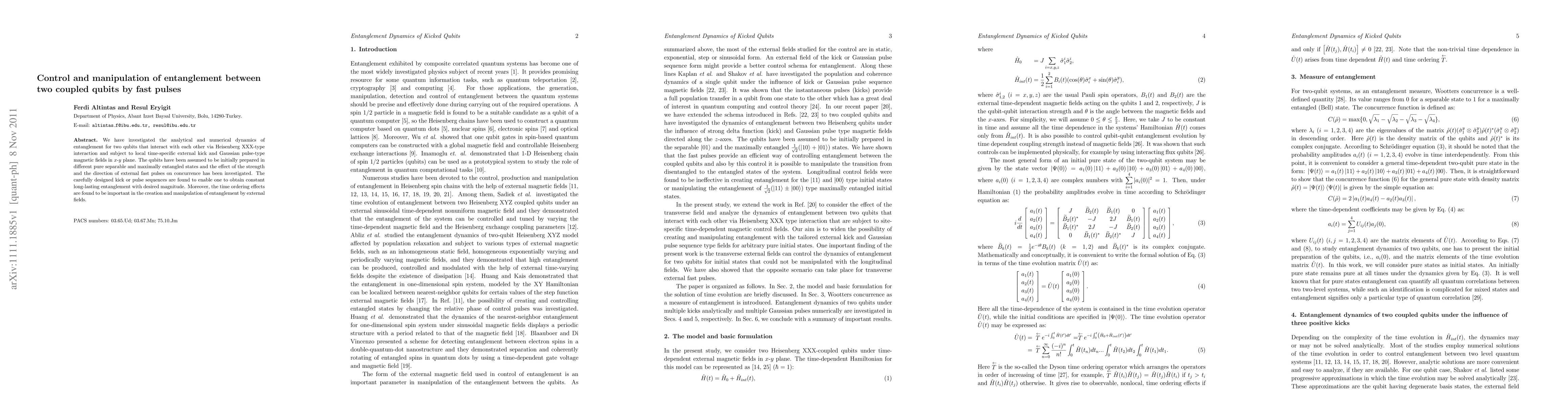 This paper explores the dynamics of entanglement between two coupled qubits under Heisenberg XXX-type interactions and external fast pulses. It finds that carefully designed pulse sequences can maintain long-lasting entanglement with controllable magnitude, highlighting the significance of time ordering in entanglement manipulation.