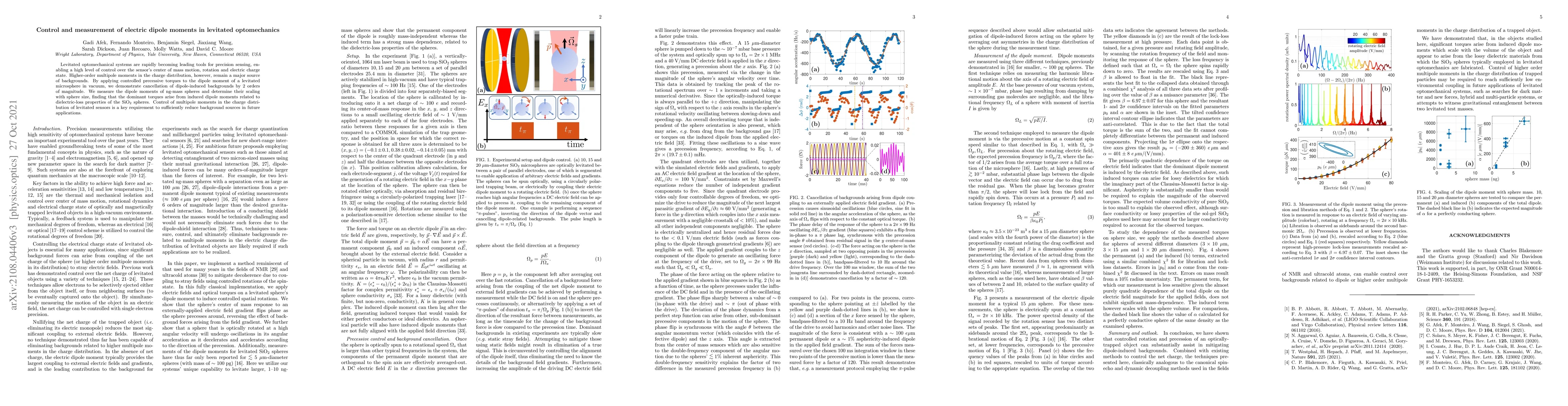 This paper demonstrates the control and measurement of electric dipole moments in levitated optomechanical systems, achieving a 2-order-of-magnitude reduction in dipole-induced background noise. The study finds that induced dipole moments, linked to the dielectric-loss properties of SiO$_2$ spheres, are the dominant source of these backgrounds.