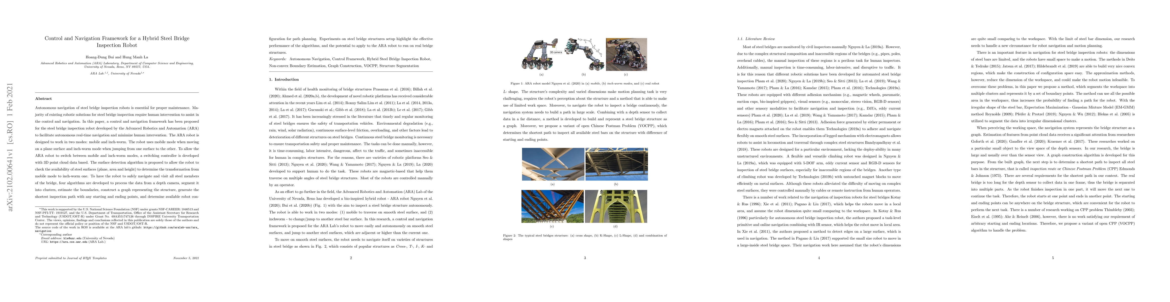 A control and navigation framework was proposed for the ARA steel bridge inspection robot, involving switching control between mobile and inch-worm modes, surface detection, and algorithms for structure segmentation, graph construction, and path planning.