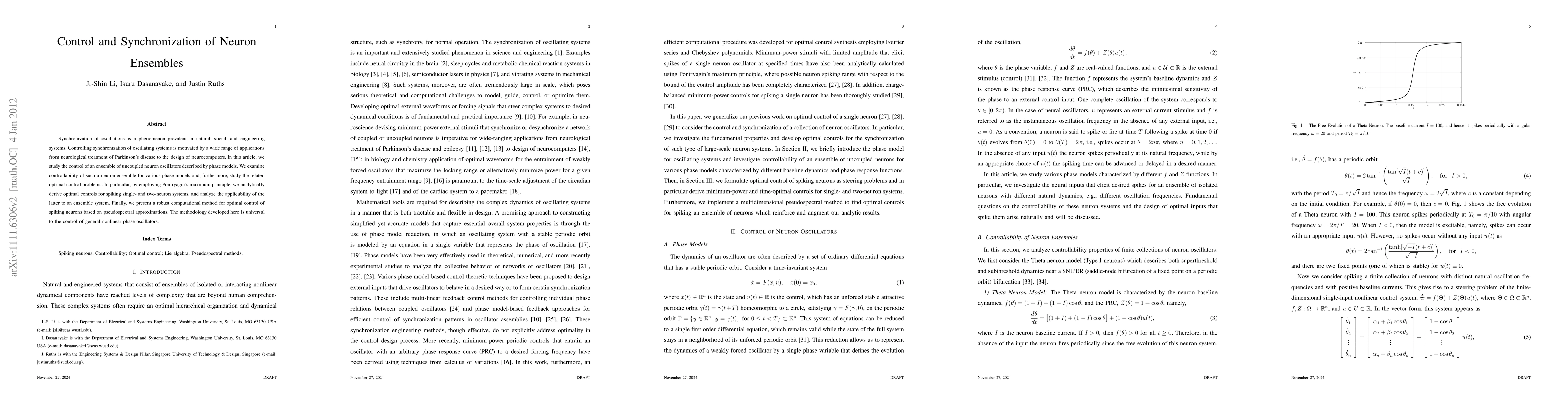 This paper explores the control and synchronization of ensembles of uncoupled neuron oscillators using phase models, deriving optimal controls for single and two-neuron systems and extending the methodology to larger ensembles. It also introduces a robust computational method based on pseudospectral approximations for optimal control of spiking neurons.