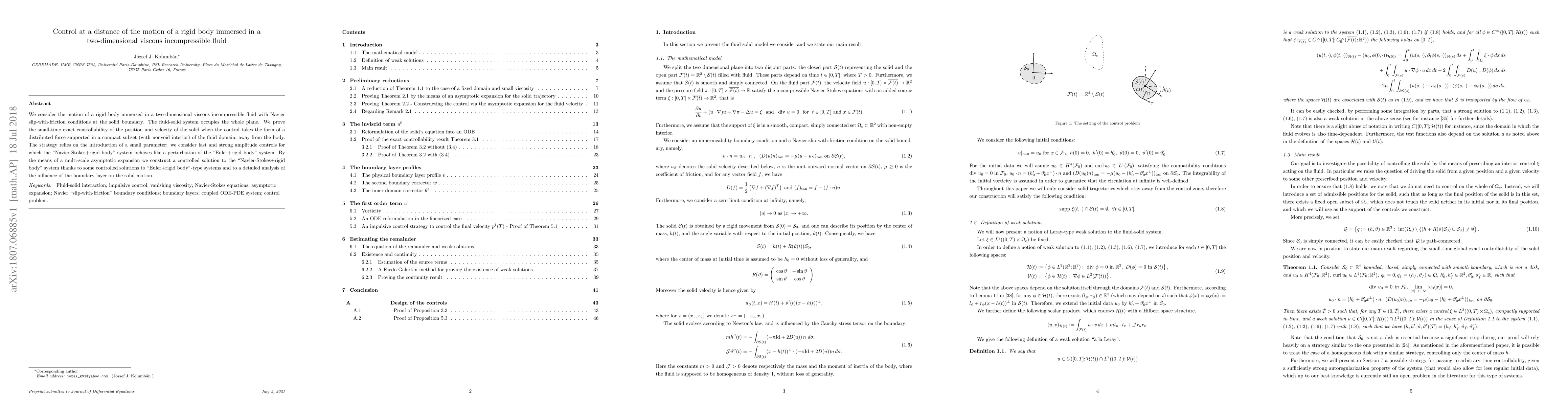 This paper proves the small-time exact controllability of a rigid body in a two-dimensional viscous incompressible fluid using a distributed control force. The control strategy leverages a small parameter and a multi-scale asymptotic expansion, comparing the Navier-Stokes system to a perturbed Euler system and analyzing the boundary layer's influence.