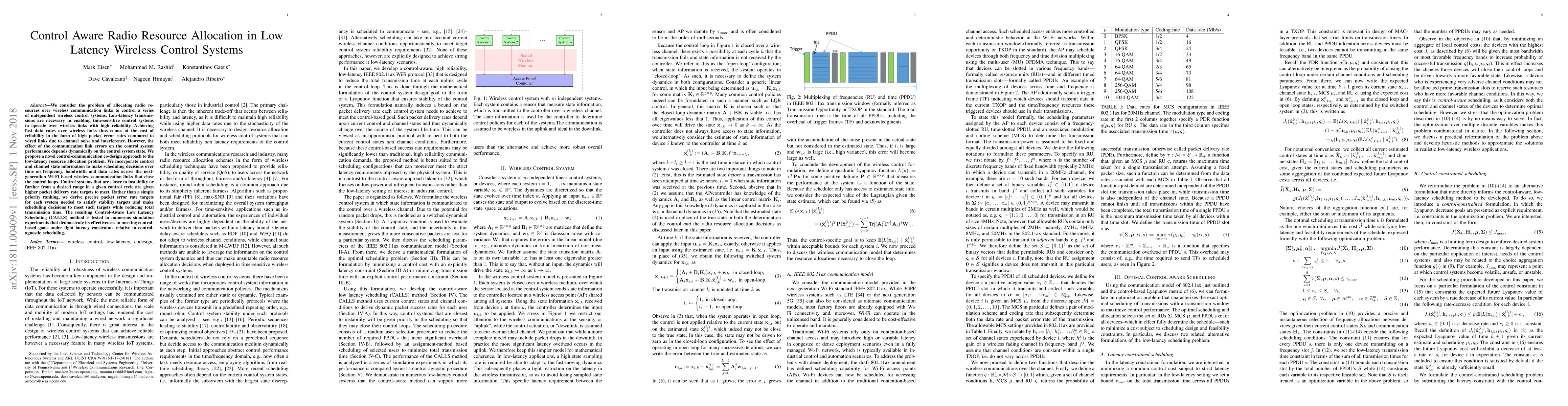 We consider the problem of allocating radio resources over wireless communication links to control a series of independent wireless control systems. Low-latency transmissions are necessary in enabling time-sensitive control systems to operate over wireless links with high reliability. Achieving fast data rates over wireless links thus comes at the cost of reliability in the form of high packet error rates compared to wired links due to channel noise and interference. However, the effect of the communication link errors on the control system performance depends dynamically on the control system state. We propose a novel control-communication co-design approach to the low-latency resource allocation problem. We incorporate control and channel state information to make scheduling decisions over time on frequency, bandwidth and data rates across the next-generation Wi-Fi based wireless communication links that close the control loops. Control systems that are closer to instability or further from a desired range in a given control cycle are given higher packet delivery rate targets to meet. Rather than a simple priority ranking, we derive precise packet error rate targets for each system needed to satisfy stability targets and make scheduling decisions to meet such targets while reducing total transmission time. The resulting Control-Aware Low Latency Scheduling (CALLS) method is tested in numerous simulation experiments that demonstrate its effectiveness in meeting control-based goals under tight latency constraints relative to control-agnostic scheduling.