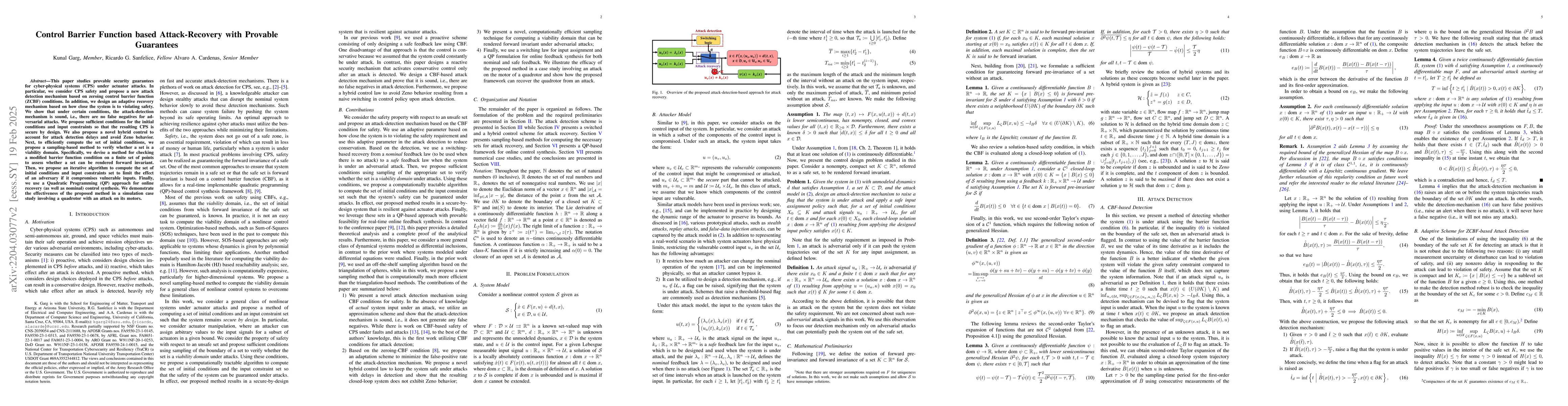 This paper proposes a control barrier function-based attack-detection mechanism for cyber-physical systems to ensure safety and presents an adaptive recovery method with provable guarantees. The method is demonstrated effective in a quadrotor simulation case study.