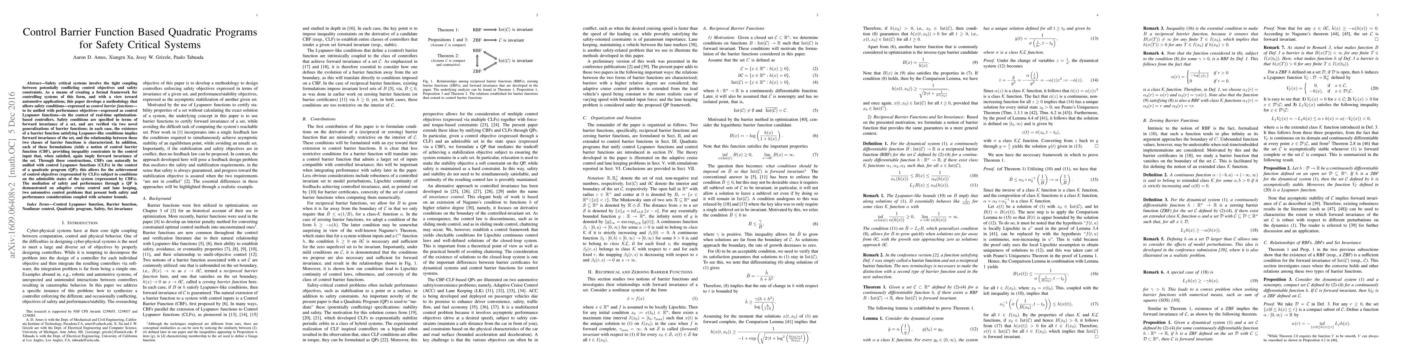 Safety critical systems involve the tight coupling between potentially conflicting control objectives and safety constraints. As a means of creating a formal framework for controlling systems of this form, and with a view toward automotive applications, this paper develops a methodology that allows safety conditions -- expressed as control barrier functions -- to be unified with performance objectives -- expressed as control Lyapunov functions -- in the context of real-time optimization-based controllers. Safety conditions are specified in terms of forward invariance of a set, and are verified via two novel generalizations of barrier functions; in each case, the existence of a barrier function satisfying Lyapunov-like conditions implies forward invariance of the set, and the relationship between these two classes of barrier functions is characterized. In addition, each of these formulations yields a notion of control barrier function (CBF), providing inequality constraints in the control input that, when satisfied, again imply forward invariance of the set. Through these constructions, CBFs can naturally be unified with control Lyapunov functions (CLFs) in the context of a quadratic program (QP); this allows for the achievement of control objectives (represented by CLFs) subject to conditions on the admissible states of the system (represented by CBFs). The mediation of safety and performance through a QP is demonstrated on adaptive cruise control and lane keeping, two automotive control problems that present both safety and performance considerations coupled with actuator bounds.