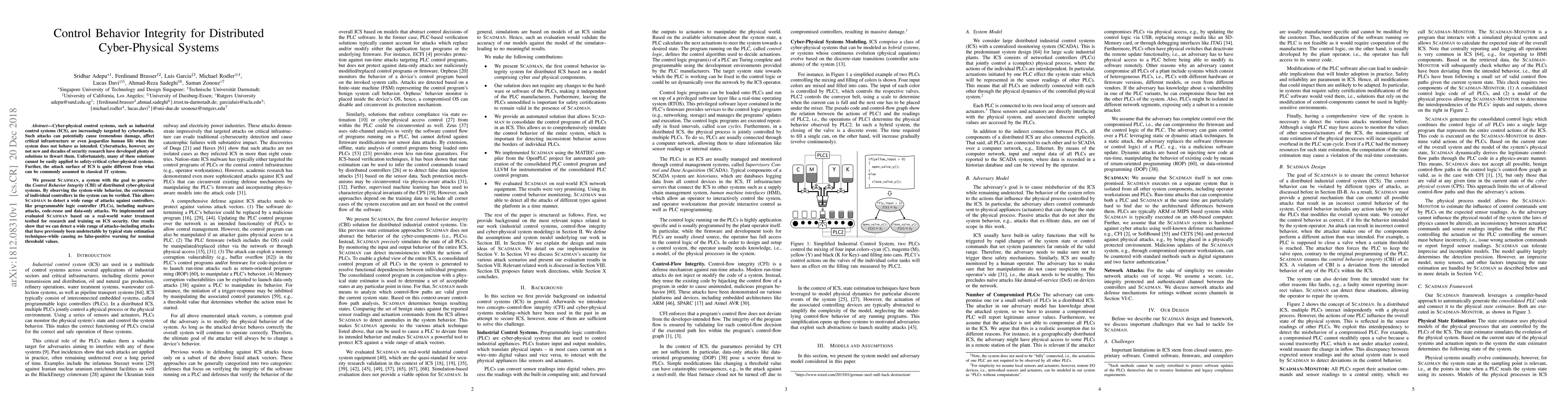 This paper introduces Scadman, a system designed to maintain Control Behavior Integrity (CBI) in distributed cyber-physical systems, detecting attacks like malware, code-reuse, and data-only attacks on controllers. Scadman was evaluated on a real-world water treatment testbed, demonstrating effective attack detection without false positives.