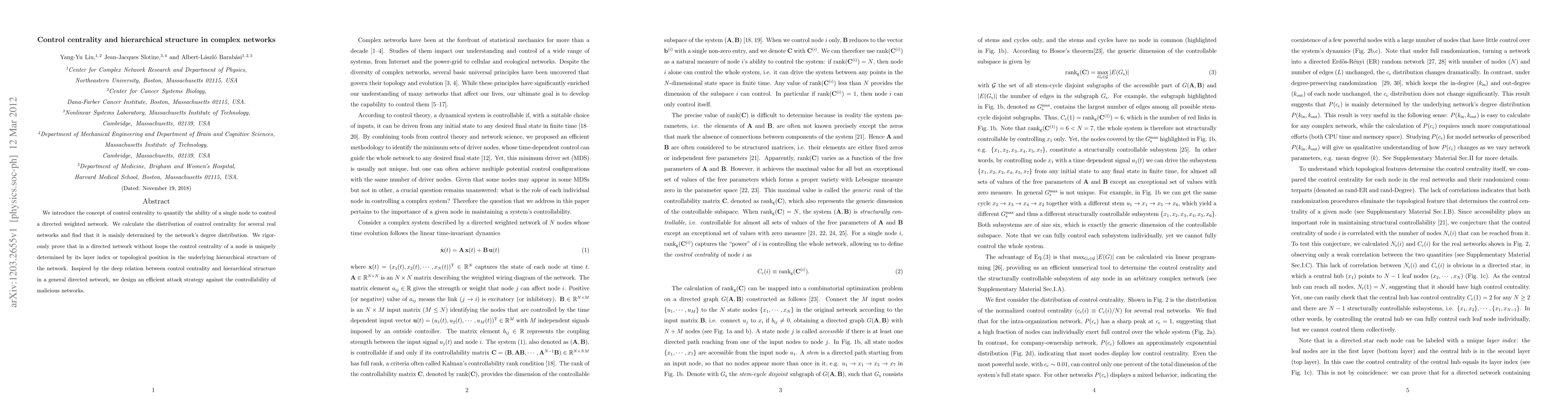 This paper introduces control centrality to measure a node's ability to control a directed network, showing its distribution is mainly influenced by the network's degree distribution. It proves that control centrality in a directed network without loops is determined by the node's hierarchical position, leading to an efficient attack strategy against malicious networks.
