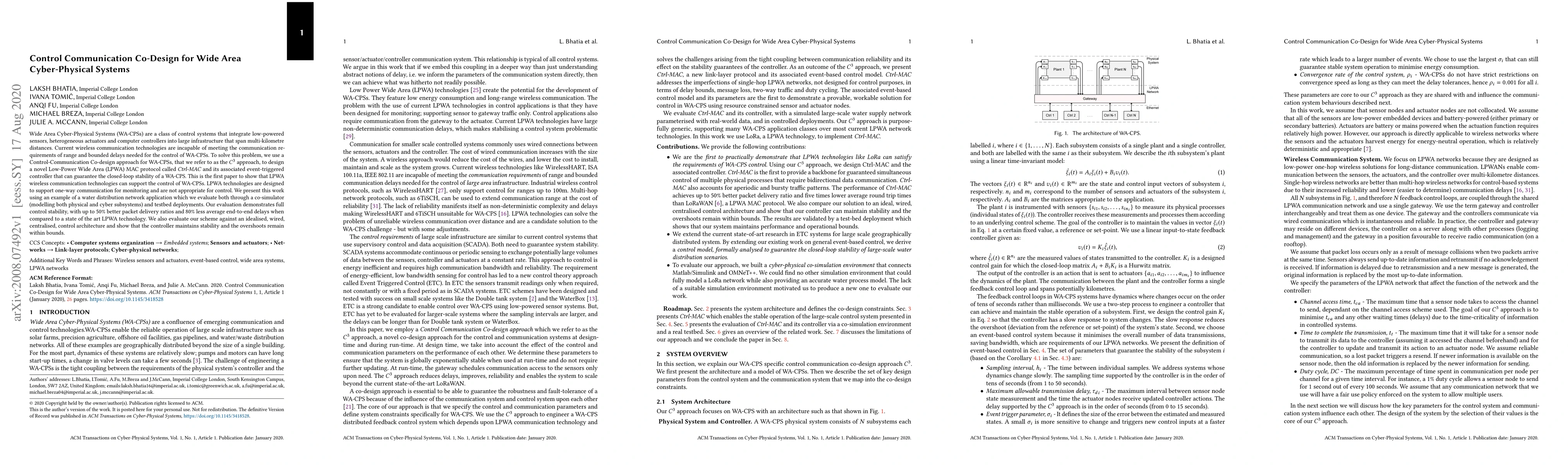 Wide Area Cyber-Physical Systems (WA-CPSs) are a class of control systems that integrate low-powered sensors, heterogeneous actuators and computer controllers into large infrastructure that span multi-kilometre distances. Current wireless communication technologies are incapable of meeting the communication requirements of range and bounded delays needed for the control of WA-CPSs. To solve this problem, we use a Control-Communication Co-design approach for WA-CPSs, that we refer to as the $C^3$ approach, to design a novel Low-Power Wide Area (LPWA) MAC protocol called \textit{Ctrl-MAC} and its associated event-triggered controller that can guarantee the closed-loop stability of a WA-CPS. This is the first paper to show that LPWA wireless communication technologies can support the control of WA-CPSs. LPWA technologies are designed to support one-way communication for monitoring and are not appropriate for control. We present this work using an example of a water distribution network application which we evaluate both through a co-simulator (modelling both physical and cyber subsystems) and testbed deployments. Our evaluation demonstrates full control stability, with up to $50$\% better packet delivery ratios and $80$\% less average end-to-end delays when compared to a state of the art LPWA technology. We also evaluate our scheme against an idealised, wired, centralised, control architecture and show that the controller maintains stability and the overshoots remain within bounds.