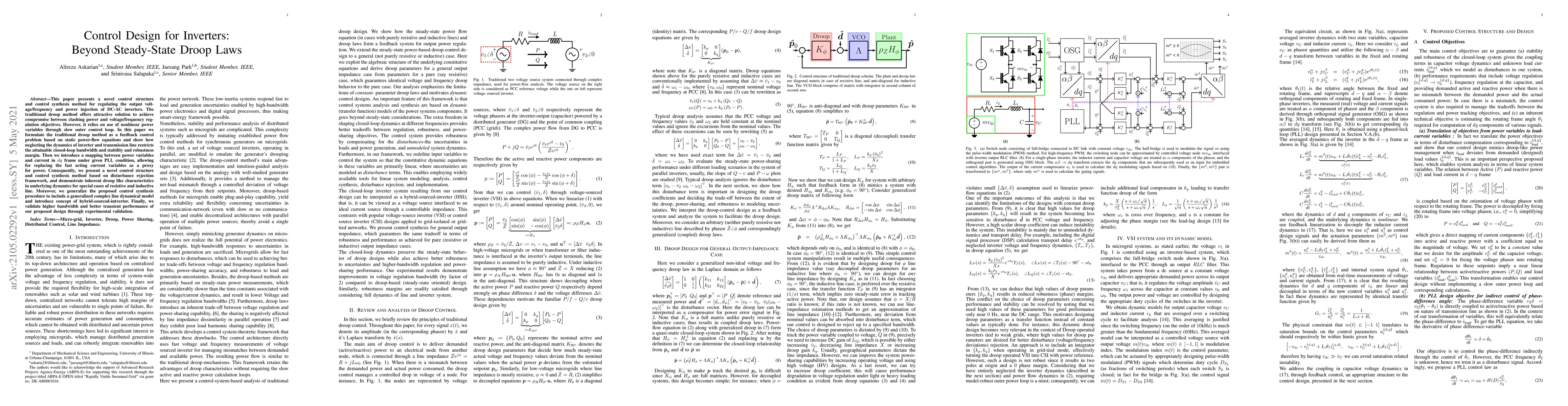 This paper presents a novel control structure and control synthesis method for regulating the output voltage/frequency and power injection of DC-AC inverters. The traditional droop method offers attractive solution to achieve compromise between clashing power and voltage/frequency regulation objectives. However, it relies on use of nonlinear power variables through slow outer control loop. In this paper we formulate the traditional droop method as a feedback control problem based on static power-flow equations and show how neglecting the dynamics of inverter and transmission line restricts the attainable closed-loop bandwidth and stability and robustness margin. Then we introduce a mapping between power variables and current in $dq$ frame under given PLL condition, allowing for replacing the fast acting current variables as a proxy for power. Consequently, we present a novel control structure and control synthesis method based on disturbance rejection framework, and demonstrate inherent droop like characteristics in underlying dynamics for special cases of resistive and inductive line. Moreover, we generalize the proposed control synthesis procedure to include a generalized complex line dynamical model and introduce concept of hybrid-sourced-intverter. Finally, we validate higher bandwidth and better transient performance of our proposed design through experimental validation.