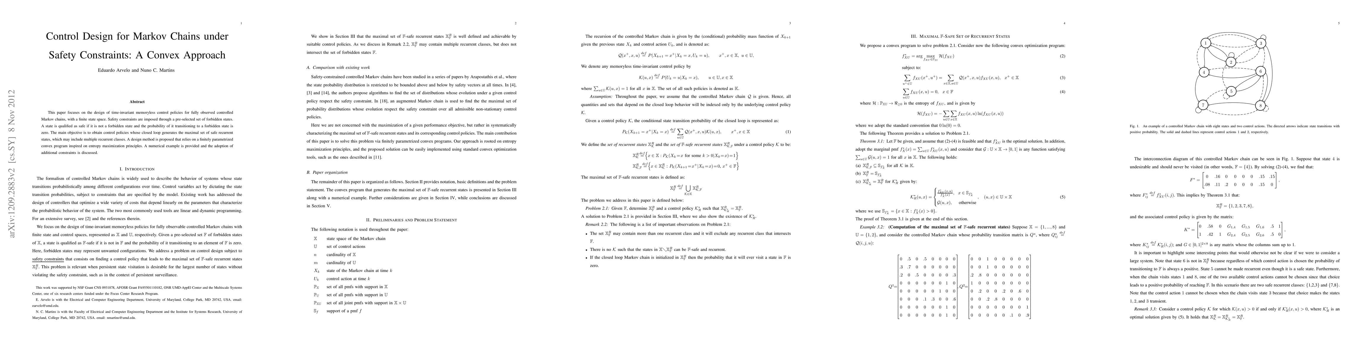 This paper proposes a convex optimization approach to design control policies for fully observed Markov chains that maximize safe recurrent states while avoiding forbidden states. The method employs a finitely parametrized convex program inspired by entropy maximization principles.