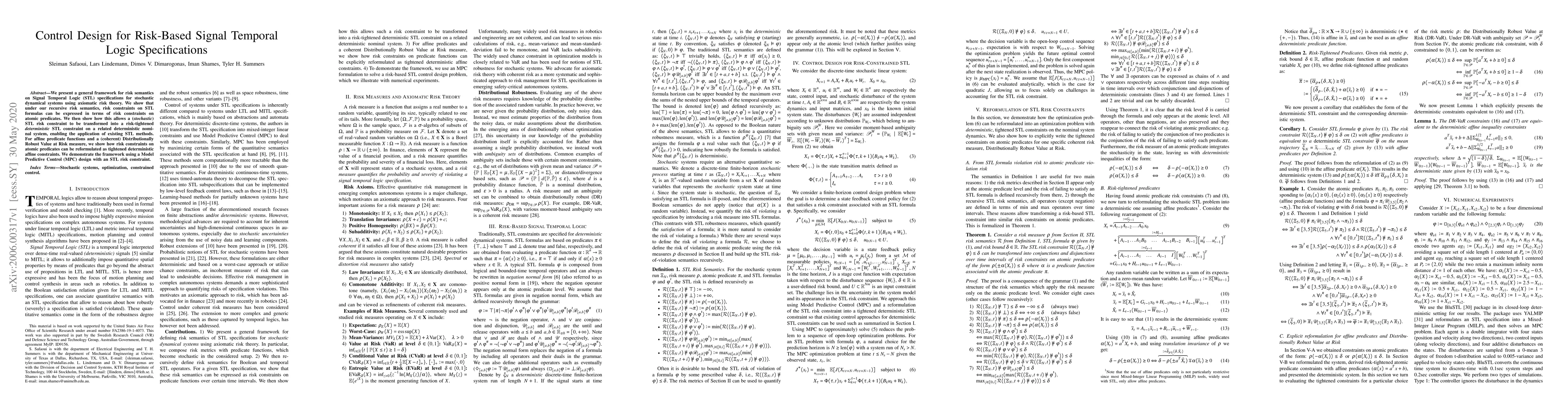 We present a general framework for risk semantics on Signal Temporal Logic (STL) specifications for stochastic dynamical systems using axiomatic risk theory. We show that under our recursive risk semantics, risk constraints on STL formulas can be expressed in terms of risk constraints on atomic predicates. We then show how this allows a (stochastic) STL risk constraint to be transformed into a risk-tightened deterministic STL constraint on a related deterministic nominal system, enabling the application of existing STL methods. For affine predicate functions and a (coherent) Distributionally Robust Value at Risk measure, we show how risk constraints on atomic predicates can be reformulated as tightened deterministic affine constraints. We demonstrate the framework using a Model Predictive Control (MPC) design with an STL risk constraint.