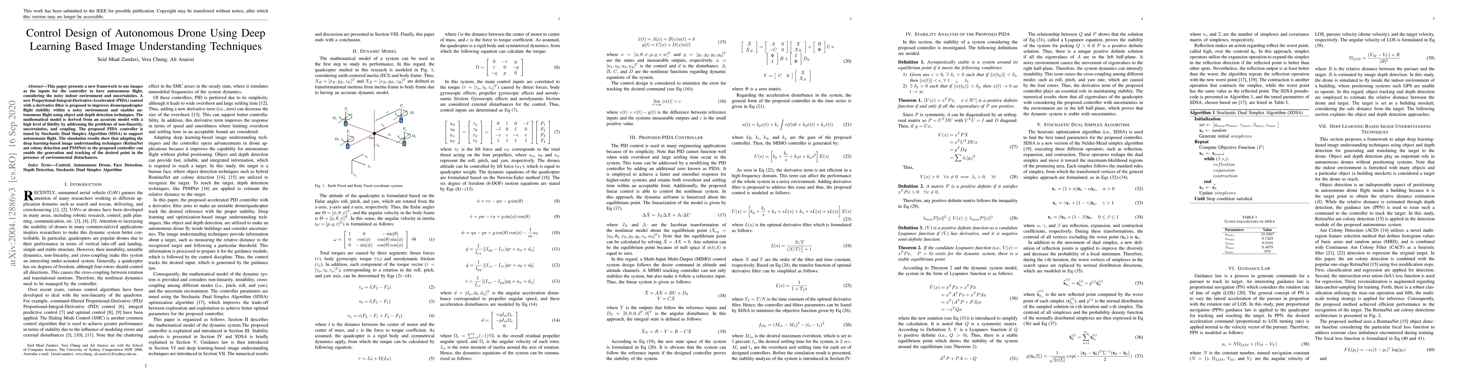 This paper presents a new framework to use images as the inputs for the controller to have autonomous flight, considering the noisy indoor environment and uncertainties. A new Proportional-Integral-Derivative-Accelerated (PIDA) control with a derivative filter is proposed to improves drone/quadcopter flight stability within a noisy environment and enables autonomous flight using object and depth detection techniques. The mathematical model is derived from an accurate model with a high level of fidelity by addressing the problems of non-linearity, uncertainties, and coupling. The proposed PIDA controller is tuned by Stochastic Dual Simplex Algorithm (SDSA) to support autonomous flight. The simulation results show that adapting the deep learning-based image understanding techniques (RetinaNet ant colony detection and PSMNet) to the proposed controller can enable the generation and tracking of the desired point in the presence of environmental disturbances.