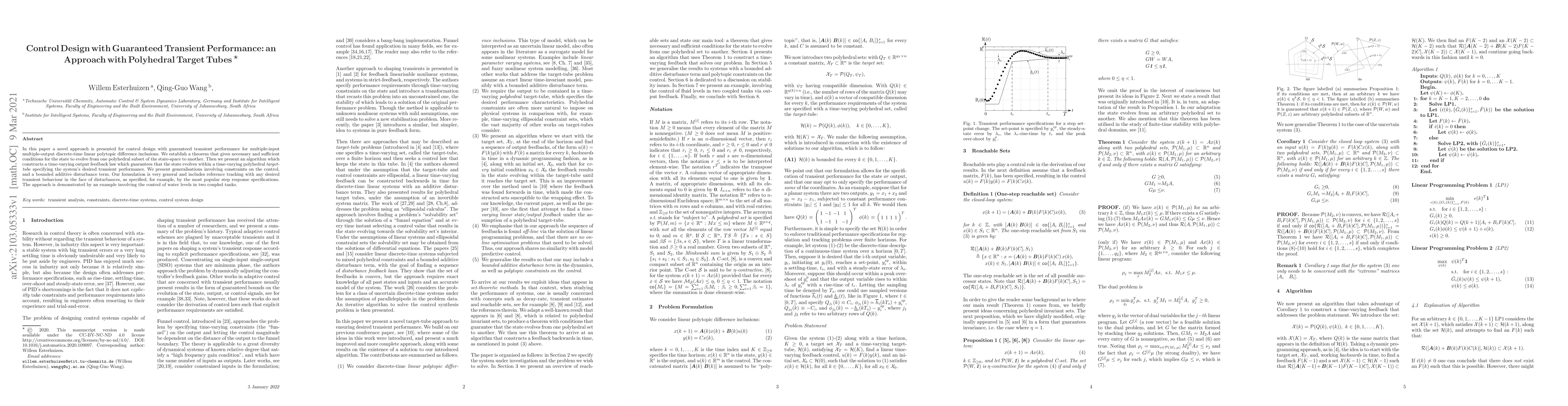 In this paper a novel approach is presented for control design with guaranteed transient performance for multiple-input multiple-output discrete-time linear polytopic difference inclusions. We establish a theorem that gives necessary and sufficient conditions for the state to evolve from one polyhedral subset of the state-space to another. Then we present an algorithm which constructs a time-varying output feedback law which guarantees that the state evolves within a time-varying polyhedral target-tube specifying the system's desired transient performance. We present generalisations involving constraints on the control, and a bounded additive disturbance term. Our formulation is very general and includes reference tracking with any desired transient behaviour in the face of disturbances, as specified, for example, by the most popular step response specifications. The approach is demonstrated by an example involving the control of water levels in two coupled tanks.