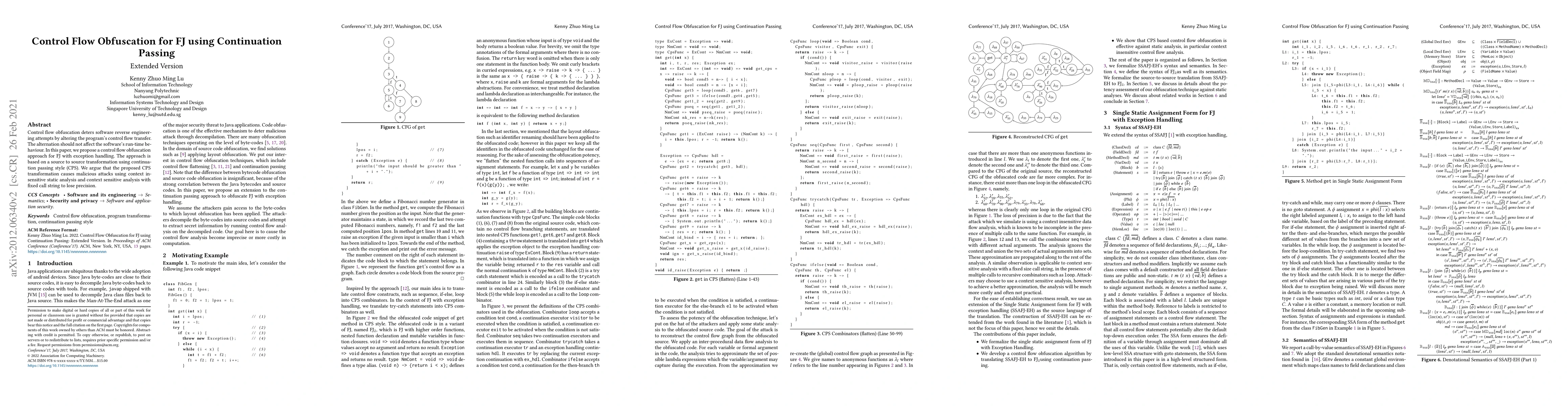 This paper proposes a control flow obfuscation method for the FJ programming language using continuation passing style (CPS) transformation, aiming to deter reverse engineering by complicating static analysis without altering runtime behavior. The CPS-based approach is argued to reduce the precision of both context-insensitive and context-sensitive static analyses.