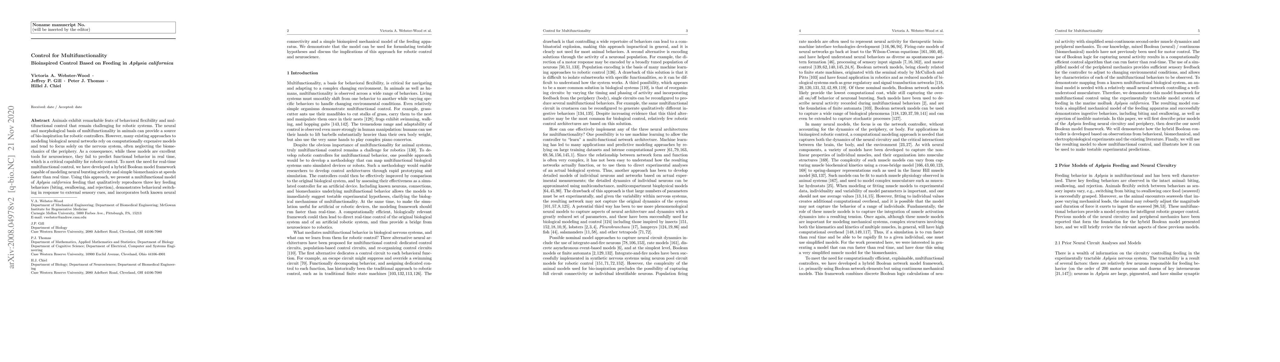 Animals exhibit remarkable feats of behavioral flexibility and multifunctional control that remain challenging for robotic systems. The neural and morphological basis of multifunctionality in animals can provide a source of bio-inspiration for robotic controllers. However, many existing approaches to modeling biological neural networks rely on computationally expensive models and tend to focus solely on the nervous system, often neglecting the biomechanics of the periphery. As a consequence, while these models are excellent tools for neuroscience, they fail to predict functional behavior in real time, which is a critical capability for robotic control. To meet the need for real-time multifunctional control, we have developed a hybrid Boolean model framework capable of modeling neural bursting activity and simple biomechanics at speeds faster than real time. Using this approach, we present a multifunctional model of Aplysia californica feeding that qualitatively reproduces three key feeding behaviors (biting, swallowing, and rejection), demonstrates behavioral switching in response to external sensory cues, and incorporates both known neural connectivity and a simple bioinspired mechanical model of the feeding apparatus. We demonstrate that the model can be used for formulating testable hypotheses and discuss the implications of this approach for robotic control and neuroscience.