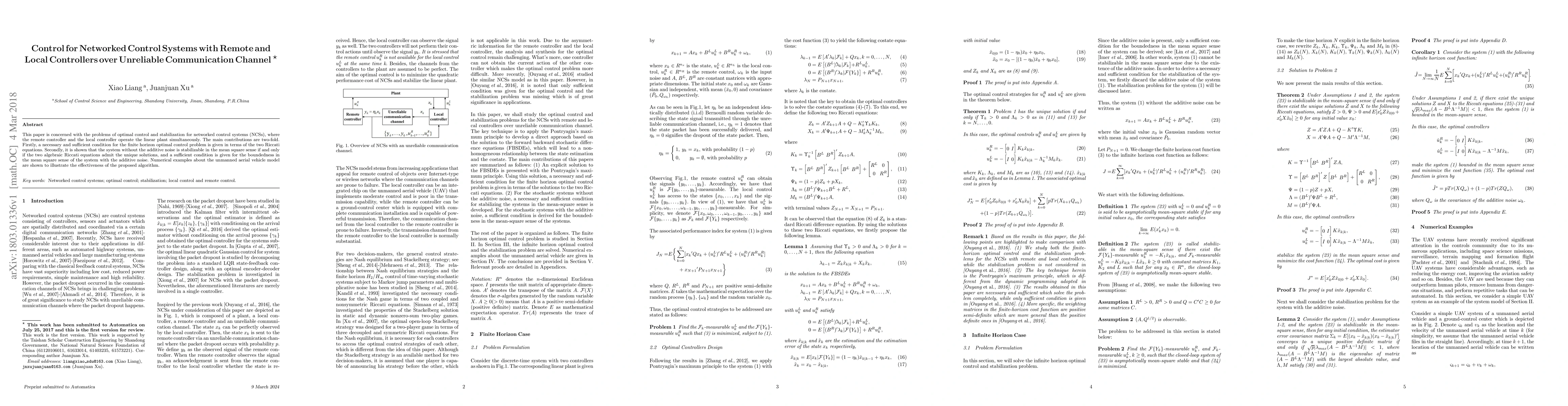 This paper presents optimal control and stabilization strategies for networked control systems with both remote and local controllers over unreliable communication channels. It provides necessary and sufficient conditions for finite horizon optimal control and proves stabilizability conditions for systems with and without additive noise, illustrated by UAV model examples.